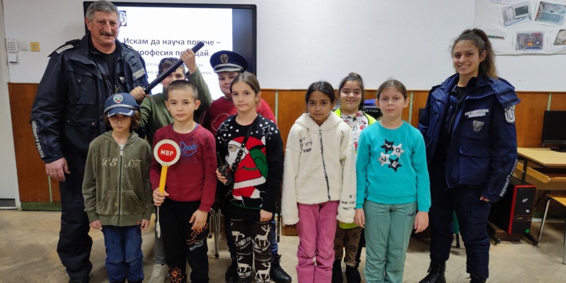 В края на миналата седмица полицейски инспектор Иван Иванов и полицай Виктория Иванова проведоха първото занятие в 4 „а“ клас в ОУ Христо Ботев“. Те запознаха малчуганите с дейността на полицията. Поясниха на децата как да разпознаят полицая, каква е униформата, отличителните знаци – шапка, светлоотразителна жилетка; част от помощните средства, които използват в ежедневната си работа (белезници, палка, каска, защитен шлем, бронежилетка, радиостанция). Лекцията бе онагледена с презентация и помощни средства – палка, белезници, стоп-палка, жилетки.