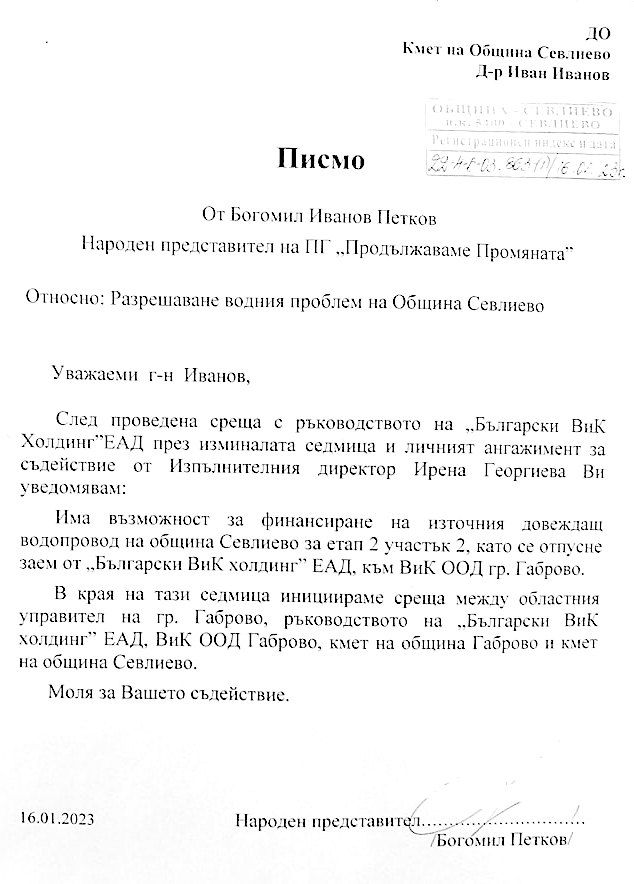 На 16 януари 2023 г. народният представител на „Продължаваме промяната“ от Бургас Богомил Петков входира в деловодството на Община Севлиево писмо с предложение да се изтегли заем от „Български ВиК холдинг“ ЕАД за довършване на Източния водопроводен клон …
