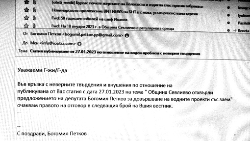 И ние очаквахме отговор от г-н Петков, но такъв не получихме. Когато се иска право на отговор се прилага и текст с прикачен файл, но такъв и в двата имейла, видно от факсимилето, няма. Пак от него става ясно, че писмото не е коректно адресирано, според изискванията и атрибутите на деловата кореспонденция, задължително условие за народен представител в качеството на какъвто беше поискано правото на отговор. Така че казаното от Богомил Петков, че сме отказали право на отговор не е истина. Както не е истина и твърдението, че е упражнена цензура от главния редактор, защото е общински съветник от определeна партия в Габрово – категорично внушение. Аз не съм член на никоя партия, общински съветник съм от гражданската квота, но дори и да съм, това е мое лично решение и няма нищо общо с професионалните ми ангажименти, като главен редактор на в.“Росица“. И още едно уточнение – “Росица” ЕООД е общинско търговско дружество и по смисъла на Търговския закон се самоиздържа и не ползва пари от бюджета на Общината, т. е от парите на данъкоплатците в Севлиево, каквито внушения продължава да прави бившия народен представител.