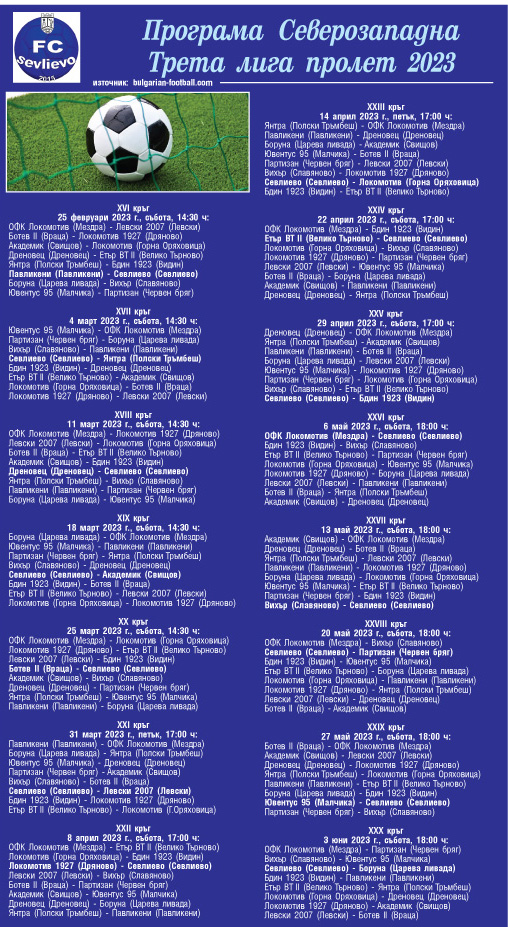 Селекцията във ФК „Севлиево“ за пролетния дял от първенството приключи. Четири са новите попълнения за втория полусезон – защитникът Симеон Спасов, халфът Любомир Вачев и нападателите Радостиян Димитров и Никола Какамъков.