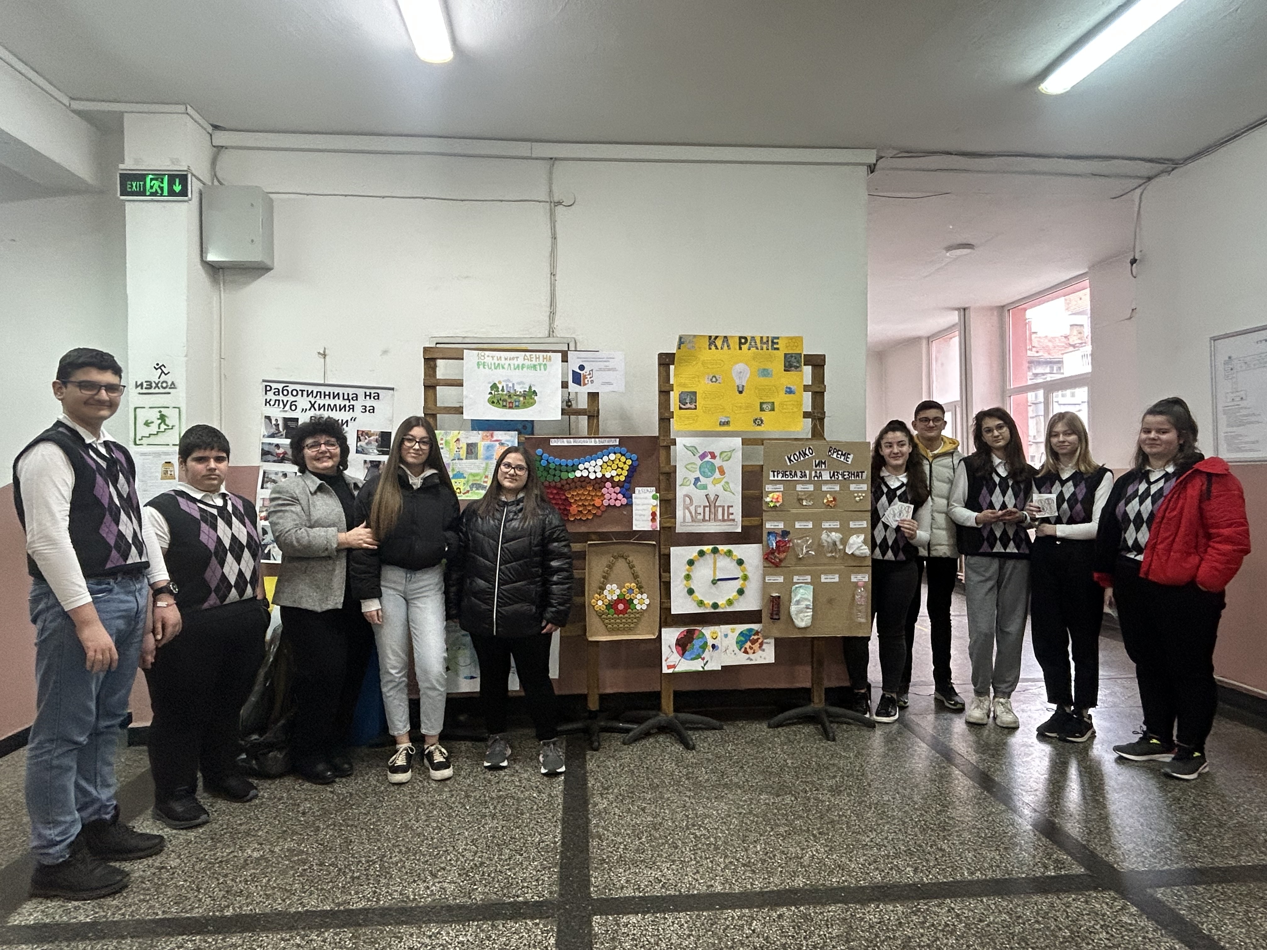 Участниците в клуб „ Ние изучаваме и опазваме природата“ с ръководител Мария Стойнова подготвиха и представиха изложба с информационни материали за разделното събиране на отпадъците и рециклирането им, постерна сесия и макети, изработени от отпадъчни материали. Със свои материали участва и клуб „ Химия за всеки“ от 10 б кл, с ръководител Ивета Кръстева. Най-много впечатлиха учениците таблото с информация за разграждането на отпадъците и макетите, изработени от пластмасови капачки! С голямо желание учениците събираха на определено за целта място използвани пластмасови бутилки, което е и една от идеите на кампанията тази година – намаляване на замърсяването с пластмасови отпадъци!