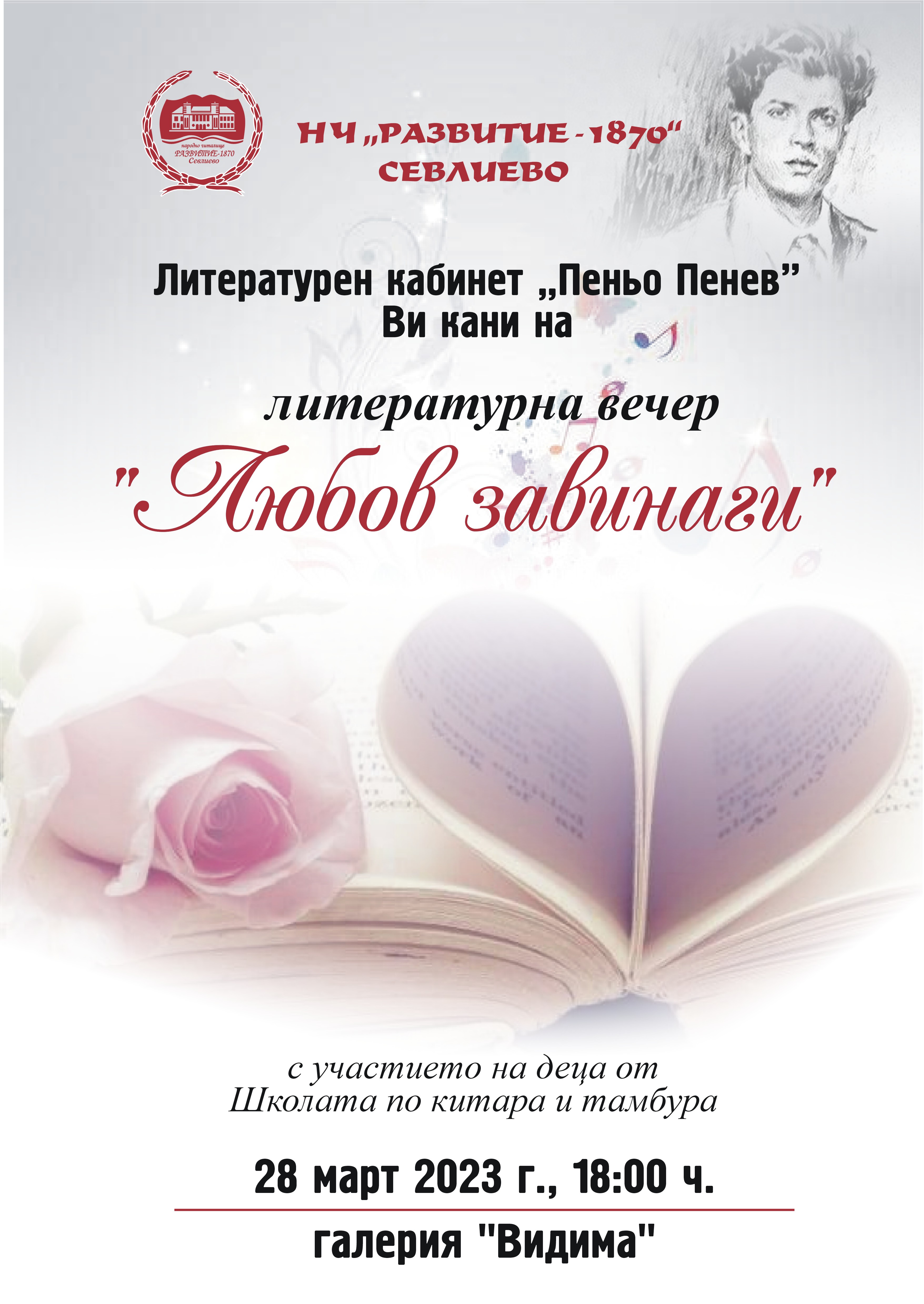 На творческа вечер „Любов завинаги” канят поетите от литературен кабинет „Пеньо Пенев” при Народно читалище „Развитие-1870”. Заповядайте на 28 март, от 18:00 ч., в галерия „Видима”. В поетичната среща ще участват с музикални изпълнения деца от Школата по китара и тамбура.