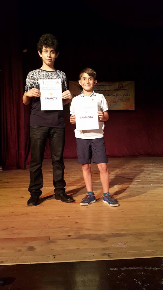 Първо място за рецитатори на руска поезия заслужиха севлиевчетата Тодор Николаев от ОУ „Стефан Пешев“ и Денислав Богданов от СУ „Васил Левски“, в зоналния етап на петия национален фестивал за руска поезия, песни и танци „Пусть всегда будет солнце!“. Ще припомним, че с първа награда от форума, който се състоя в края на май в Кнежа, се завърнаха и възпитаниците на Ваня Ангелска – вокална формация „Традиция и сцена“ при Севлиевската гимназия. Дуетът на Божидара Ганчева и Ирена Цонева от габровската детска градина „Мечо Пух“ също бе удостоен с първо място. Така за поредна година нашите деца представиха достойно областта ни в зоналния кръг, поредно бе и признанието за двамата рецитатори на руска поезия, с ръководител Наташа Колева.