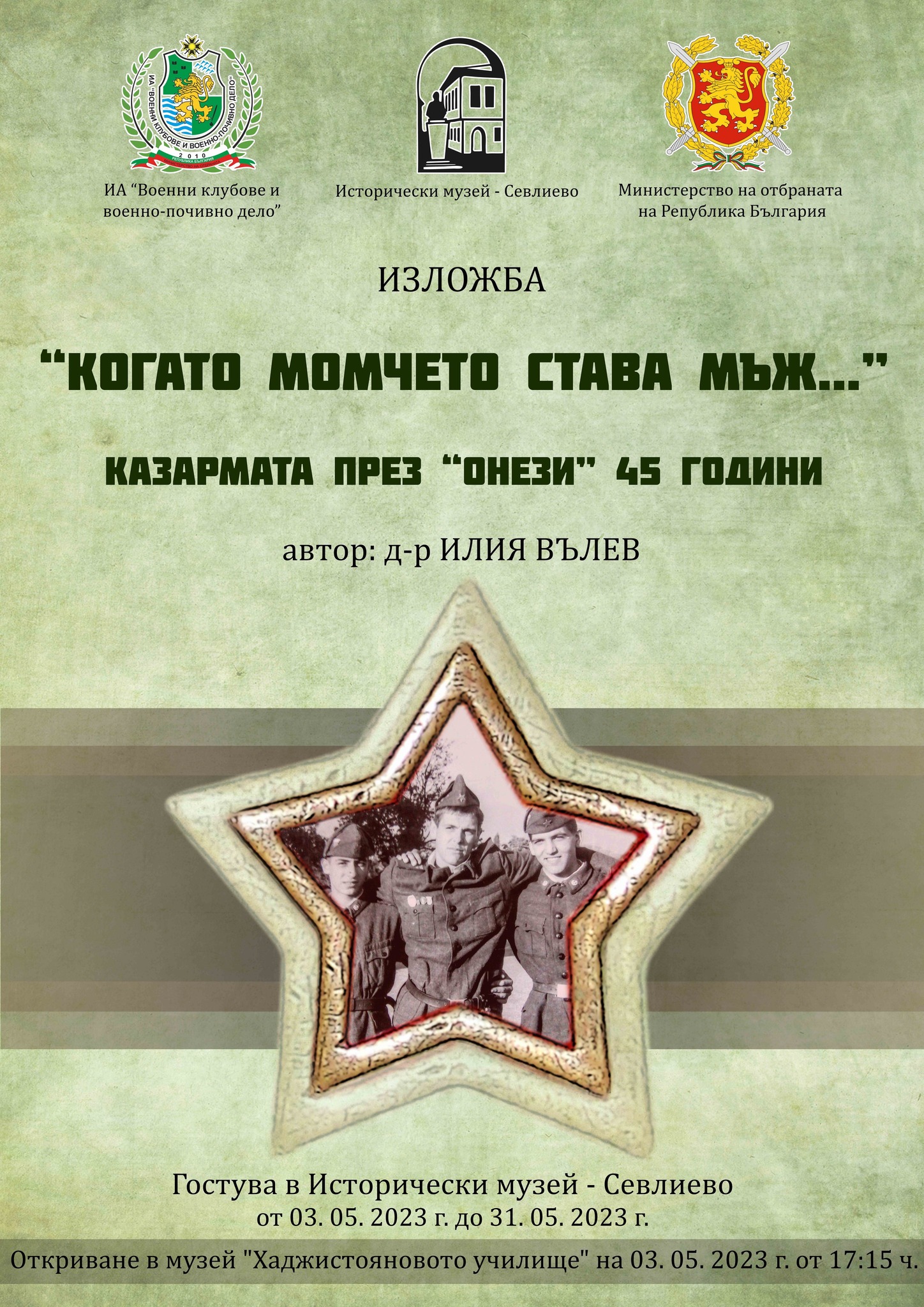 От 3 до 31 май в Историческия музей ще гостува мобилната изложба „Когато момчето става мъж…“ – Казармата през „онези“ 45 години. Неин автор е д-р Илия Вълев, етнолог, главен асистент в Националния етнографски музей към Института за етнология и фолклористка при БАН, автор на монографията „Младежки страсти, мъжки времена. Етнокултурна характеристика на българската казарма през социализма“, която е концептуалната основа на представяната изложба. Изложбата е под егидата и с финансовата подкрепа на Министерството на отбраната на Република България и Изпълнителна агенция „Военни клубове и военно-почивно дело“.