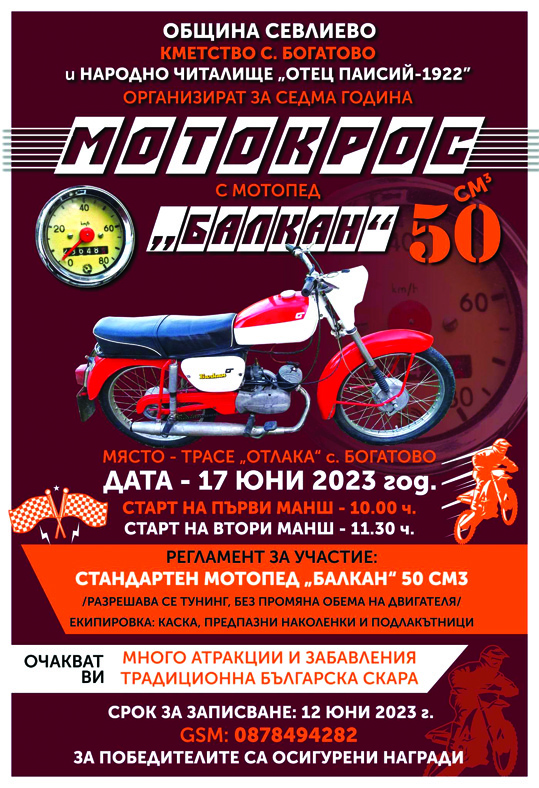 На 17 юни за седма година Община Севлиево, кметството и читалището на село Богатово организират мотокрос с мотопед "Балкан". Първия старт ще бъде даден в 10 часа на трасе "Отлака". Заповядайте!