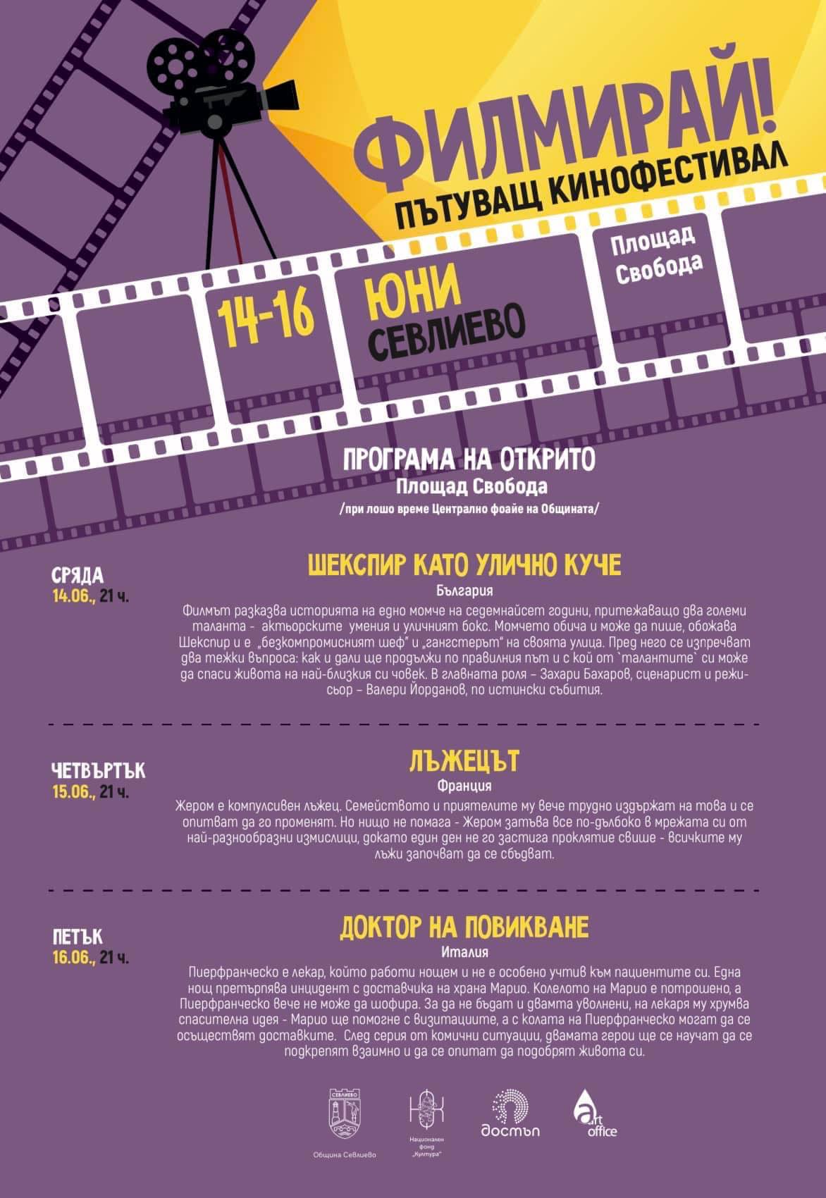 Нов, нашумял български филм и две европейски комедии предлага на публиката в Севлиево тазгодишният фестивал „Филмирай“. Както всяка година, от 14 до 16 юни, от 21 часа на площад Свобода ще бъдат показани безплатно три продукции. При лошо време прожекциите ще са във фоайето на Общината.