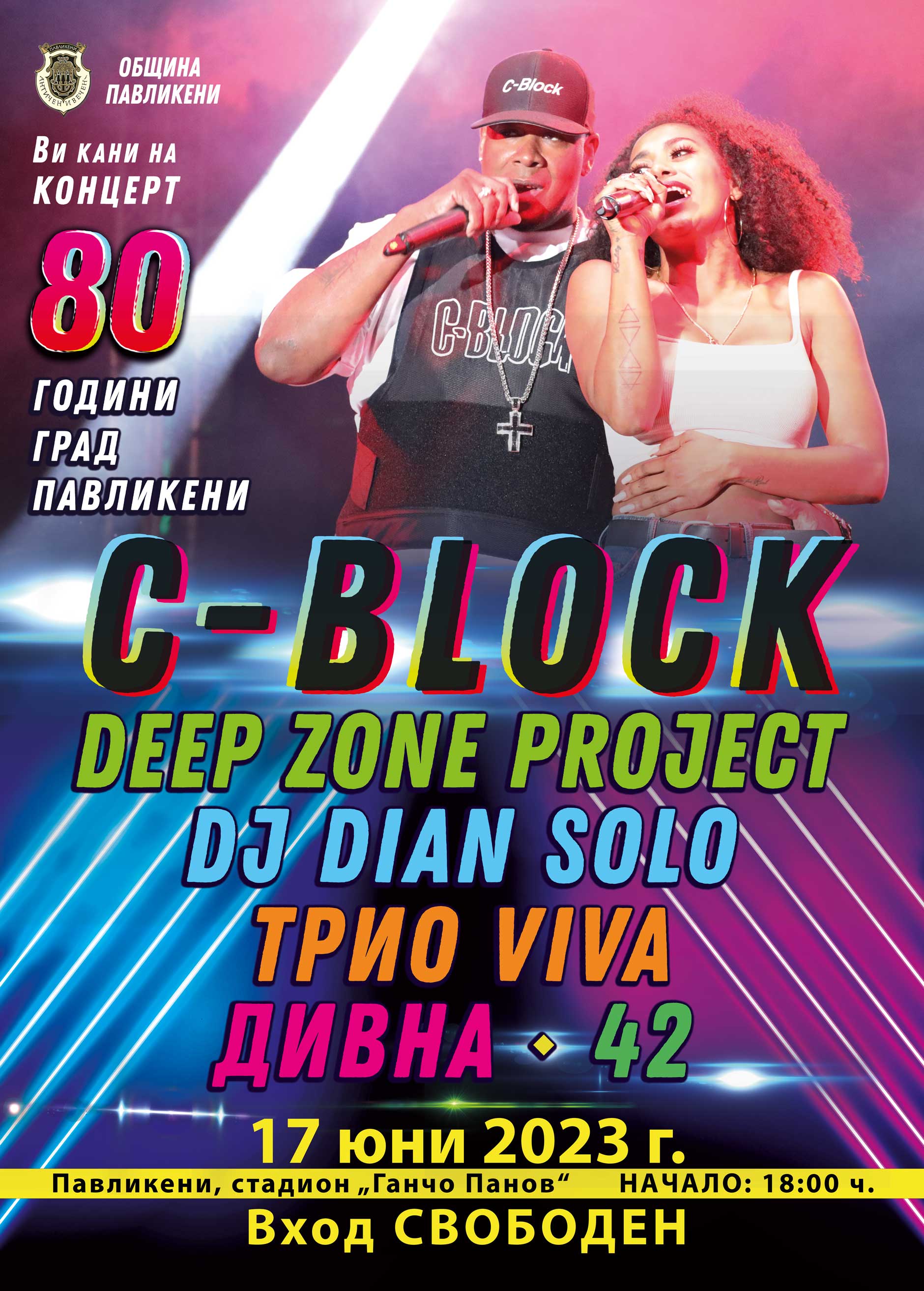 C-block са познати и обичани от българската публика. Групата е създадена в Германия през 1995 г. и бързо се утвърждава като един от най-успешните хип-хоп проекти в Европа, а и в света. Сред хитовете им са „SoStrungOut“, „TimeIsTickin’ Away“, „Summertime“ и „KeepMovin’“, които публиката в Павликени със сигурност ще чуе по време на безплатния им концерт.