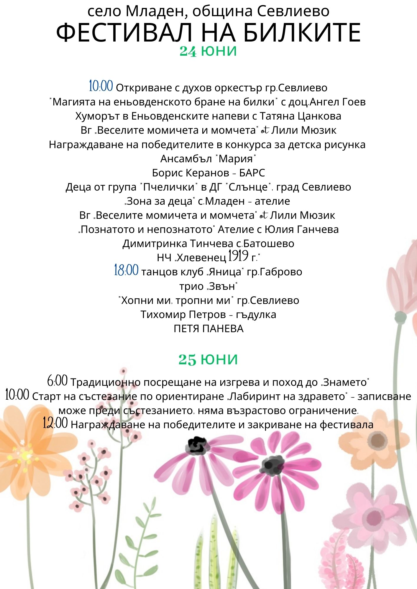 Шестото издание на Фестивала на билките ще се проведе на 24 и 25 юни в с. Младен. Създател и главен организатор на събитието е Асоциацията за културно, стопанско, евристично и лингвистично сътрудничество – АКСЕЛС и Кметството на с. Младен, с подкрепата на Община Севлиево.