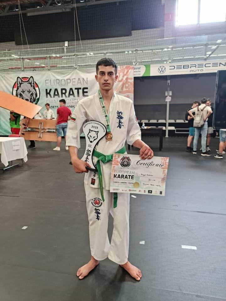 Състезателят от севлиевския клуб по карате шинкиокушин Ангел Антонов спечели бронзово отличие от завършилото в Дебрецен, Унгария Европейско първенство. Малко не достигна на другите наши представители – Константин Матев и Александра Златанова да стигнат до почетната стълбица. В Европейското за кадети, кадетки, юноши и девойки и U-21 мъже и жени участваха повече от 500 състезатели от 20 държави. България беше представена от 55 каратеки в дисциплините кумите и ката.