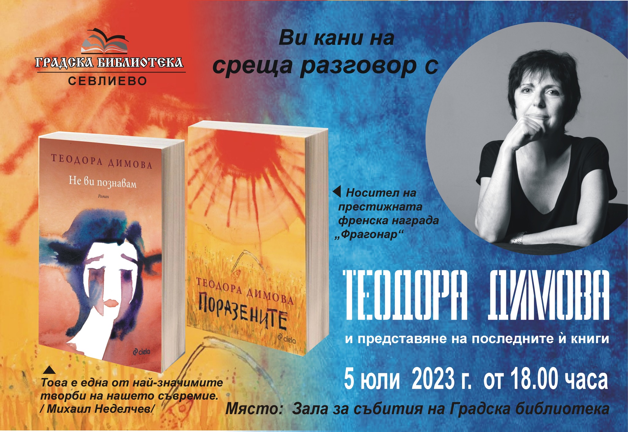На 5 юли 2023г. Теодора Димова за първи път ще гостува в Севлиево. Тя е сред най-известните и четени български писатели. Авторка е на девет пиеси, играни в страната и чужбина. Написала е романите „Емине“, „Майките“, „Адриана“, „Марма, Мариам“, „Влакът за Емаус” и повестта „Първият рожден ден”. През 2007 г. „Майките“ спечели Голямата награда за източноевропейска литература на Bank Austria и KulturKontakt. През 2010 г. „Марма, Мариам“ спечели Националната награда „Хр. Г. Данов“ за българска художествена литература. През 2019 г. Теодора Димова става носител на наградата „Хр. Г. Данов” за цялостен принос в българската книжнина. През същата година излиза романът и “Поразените“, който по-късно се превърна в Роман на годината на НДФ „13 века България”, спечели наградата за проза „Перото“ и „Цветето на Хеликон“ за най-продавана книга. През 2022 г. „Поразените“ получи новоучредената френска литературна награда „Фрагонар“. Същата година Теодора Димова става носител на Голямата награда за литература на Софийския университет „Св.Климент Охридски”.