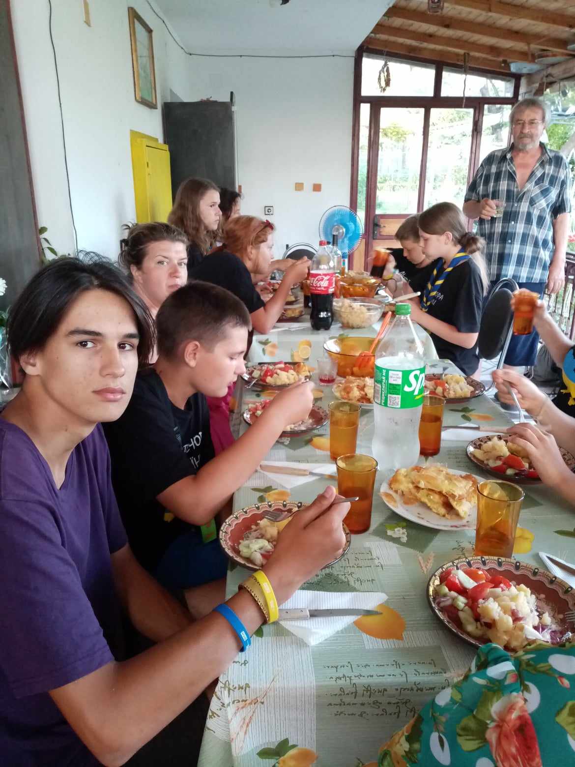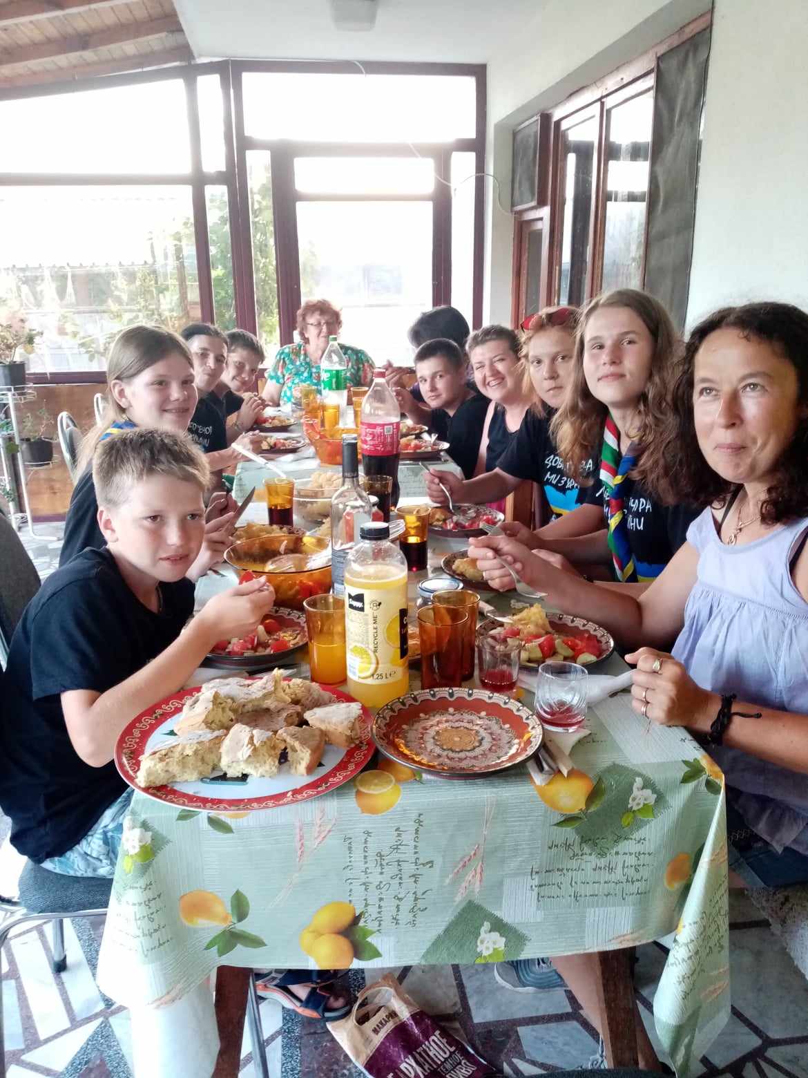 Отделно от това, желанието ни беше да ги запознаем и с някои български традиционни ястия. Затова организирахме традиционна вечеря в селски дом. Посрещнахме ги по наш обичай – с питка и шарена сол. А заедно с тях приготвихме две баници: вита и наложена. Украинчетата с интерес гледаха приготвянето им, тъй като за тях това беше нещо ново, интересно и… много вкусно. С продукти от градината – домати, краставици и лук, сами направиха шопска салата. Организирахме им забавни състезателни игри. Пяхме песни до късна вечер. Удовлетворението от споделената вечер беше взаимно. Децата си тръгнаха с надеждата, че ако всичко е наред при тях, догодина отново да ни гостуват.
