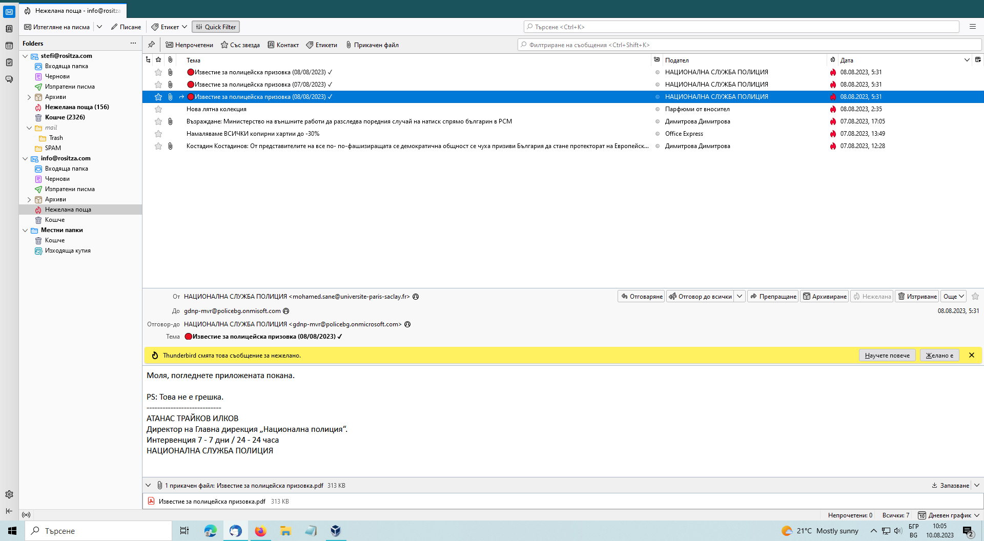 Под прикачения файл, който е в PDF формат, пише „Моля, погледнете приложената покана. PS:Това не е грешка“. А най-отдолу са посочени и имената на подателя: „АТАНАС ТРАЙКОВ ИЛКОВ, директор на Главна дирекция „Национална полиция“. Интервенция 7 – 7 дни / 24 – 24 часа. НАЦИОНАЛНА СЛУЖБА ПОЛИЦИЯ“. Любопитна подробност е, че имейлът е изпратен доста преди работното време на службата, в 04:31:33 часа.