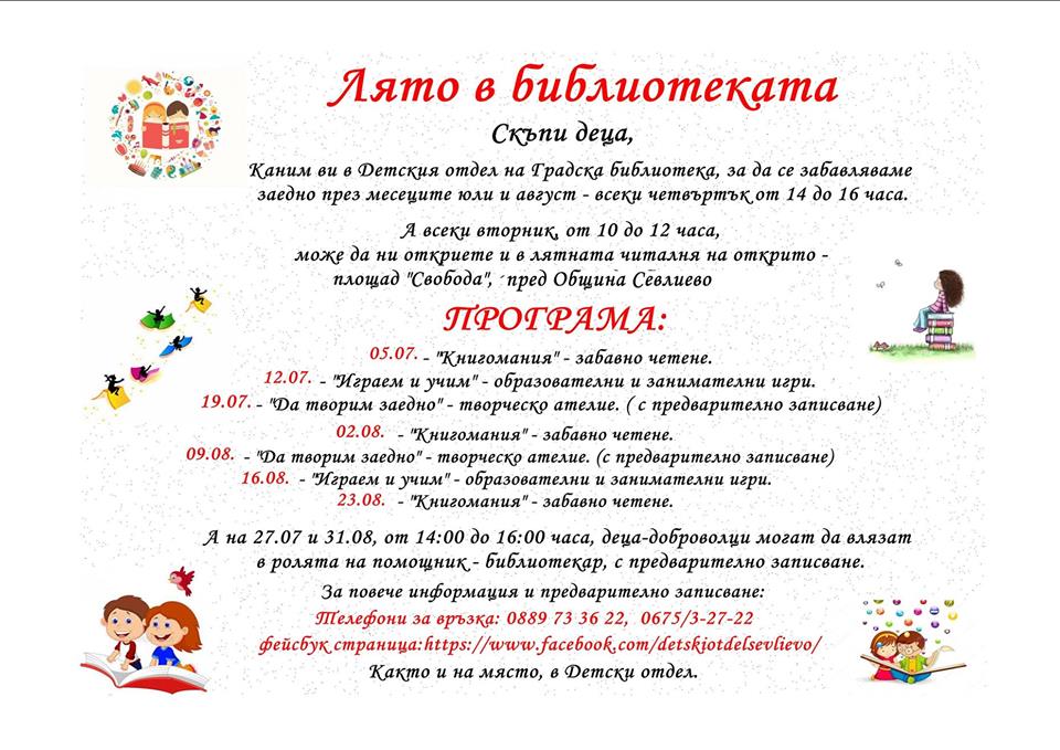 За пръв път тази година за децата на Севлиево ще има забавна лятна читалня на открито. Тя ще се провежда всеки вторник, от 10 до 12 часа, на площад „Свобода“. Освен да почетат, децата ще могат да поиграят на различни забавни игри, да изработят сами фигури от хартия, да рисуват или да оцветяват приказни герои. Четива ще има дори и за най-малките.