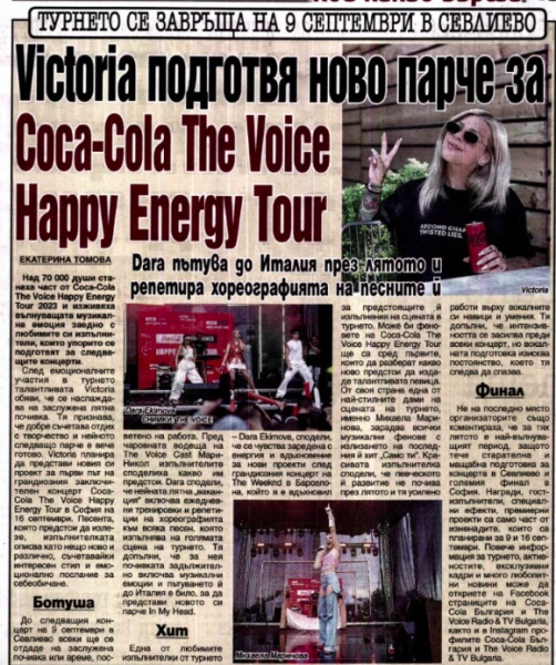 Една от любимите изпълнителки от турнето – Dara Ekimova, сподели, че се чувства заредена с енергия и вдъхновение за нови проекти след грандиозния концерт на The Weeknd в Барселона, който я е вдъхновил за предстоящите и изпълнения на сцената в турнето. Може би феновете на Coca-Cola The Voice Happy Energy Tour ще са сред първите, които да разберат какво ново предстои да издаде талантливата певица. От своя страна една от най-стилните дами на сцената на турнето, именно Михаела Маринова, зарадва всички музикални фенове с излизането на последния й хит „Само ти“. Красивата изпълнителка сподели, че певческото й развитие не почива през лятото и тя усилено работи върху вокалните си навици и умения. Тя допълни, че интензивността се засилва преди всеки концерт, но вокалната подготовка изисква постоянство, което тя следва да спазва.