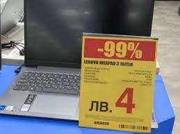 „В склада на Amazon в София стана инцидент, при който бяха повредени транспортните кутии с партида лаптопи Lenovo. Amazon организира промоция и ги предлага на жителите на България само за 4 лева. За да поръчате лаптоп Lenovo за 4 лева, влезте в сайта и попълнете формуляра”, гласи текстът на обявата, придружен с огромна снимка на лаптопи и набиващата се на очи нищожна цена.