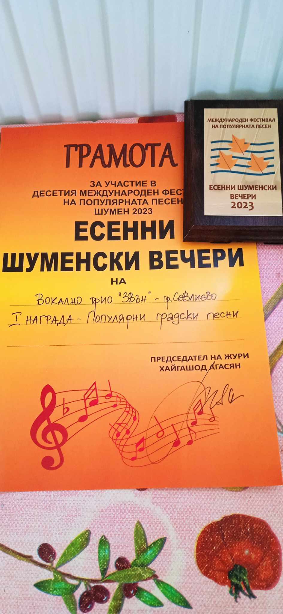 За да представят своето изкуство севлиевките от трио „Звън” – Снежана, Миглена и Павлинка, завладяха още една сцена – тази на читалище „Добри Войников” в град Шумен. Международният фестивал на популярната песен „Есенни шуменски вечери“ се провежда всяка година и има конкурсен характер. В тазгодишното юбилейно издание изпълнители от Шумен, Варна, Бургас, София, Силистра, Нови пазар, Търговище, Несебър, Свиленград, от украинския град Измаил се впуснаха в надпреварата за разпределяне на наградите.