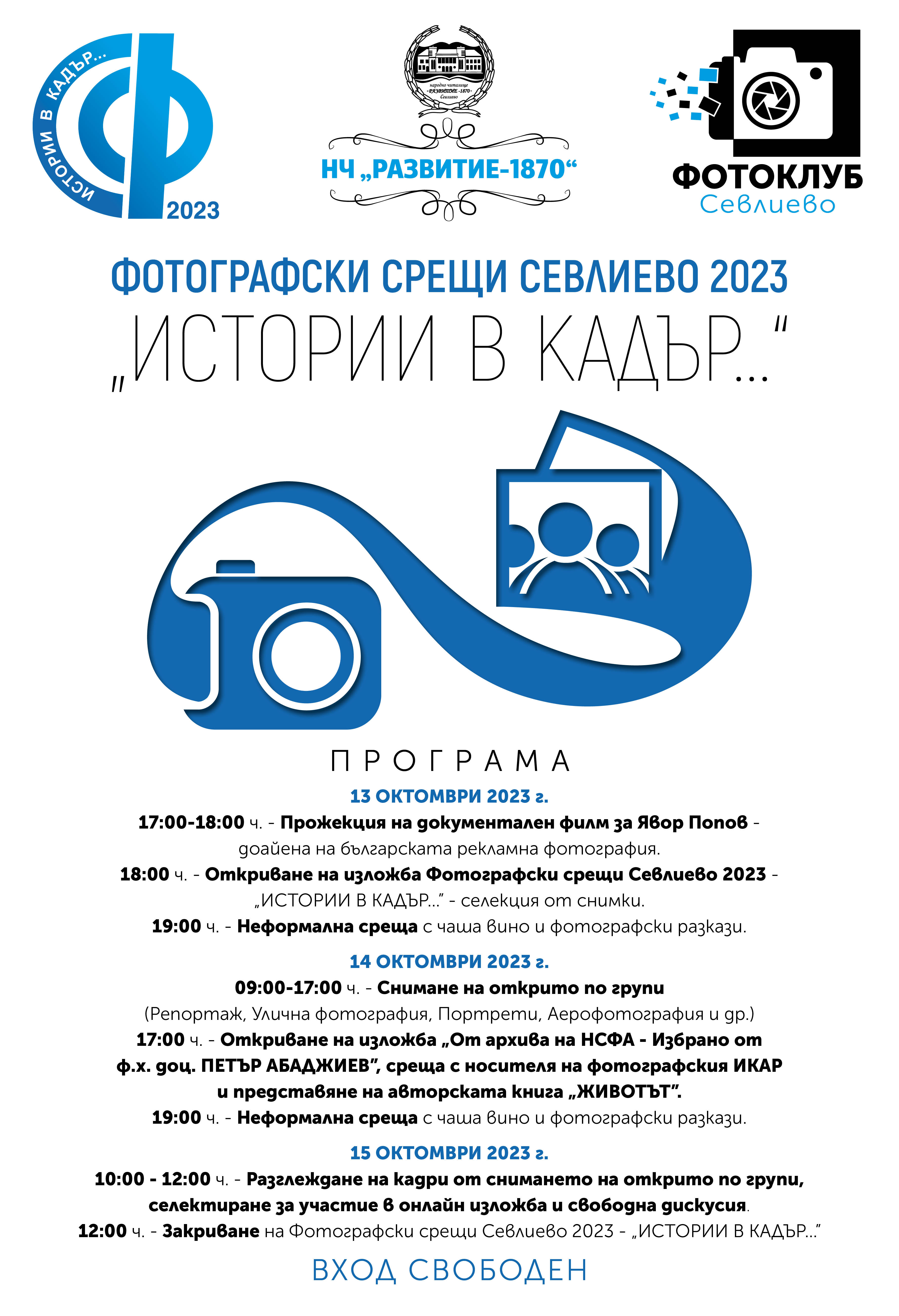 12:00 ч. – Закриване на Фотографски срещи Севлиево 2023 – „ИСТОРИИ В КАДЪР…”.