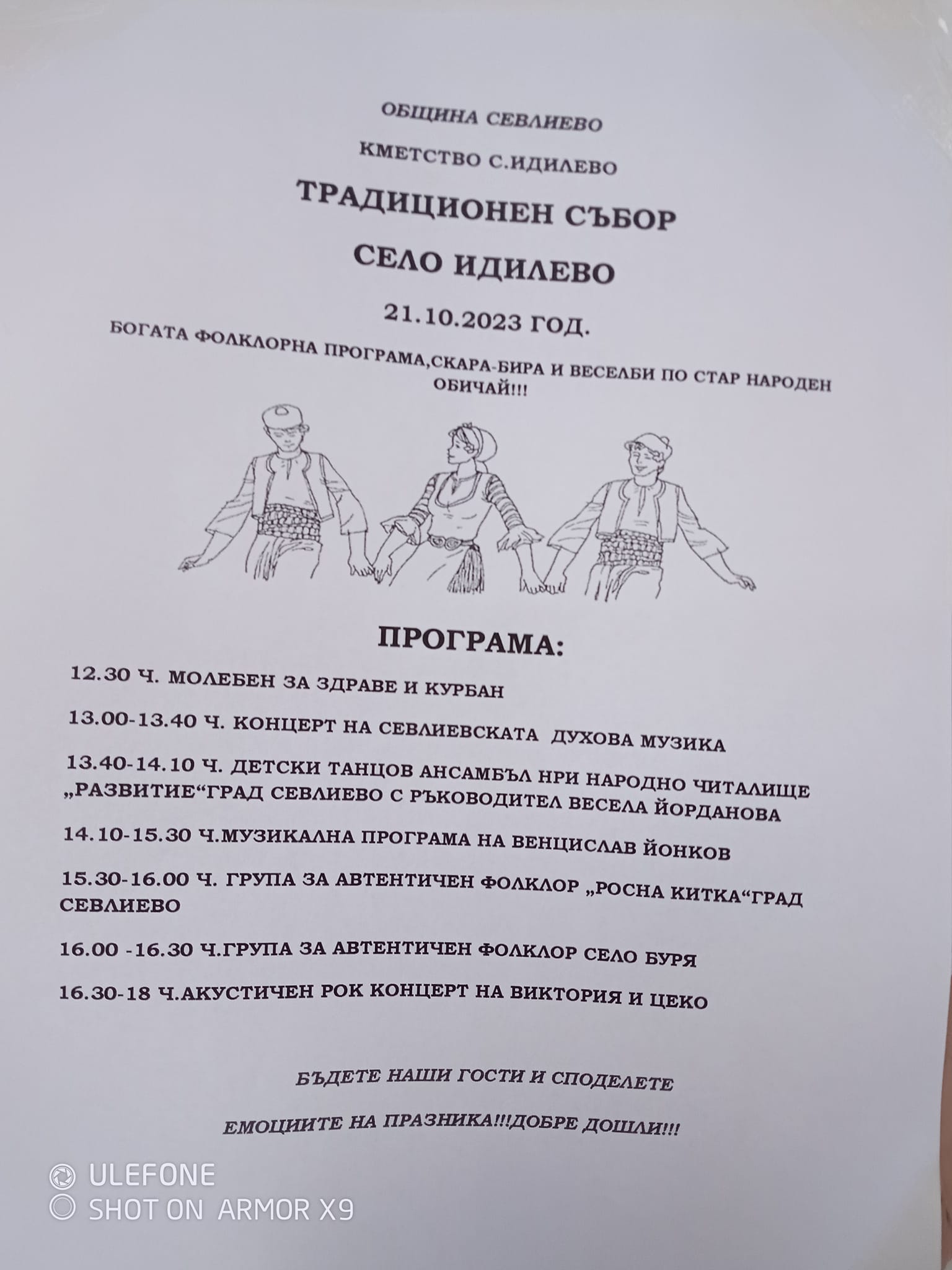 „Постарали сме се да направим разнообразна програма, за да има по нещо и за младите и за по-възрастните. За да разберете каква е тя, ви каним да дойдете на празника ни в събота – 21 октомври, от 12:00 часа, за да празнуваме заедно. Бъдете наши гости!“, канят от Кметство Идилево.