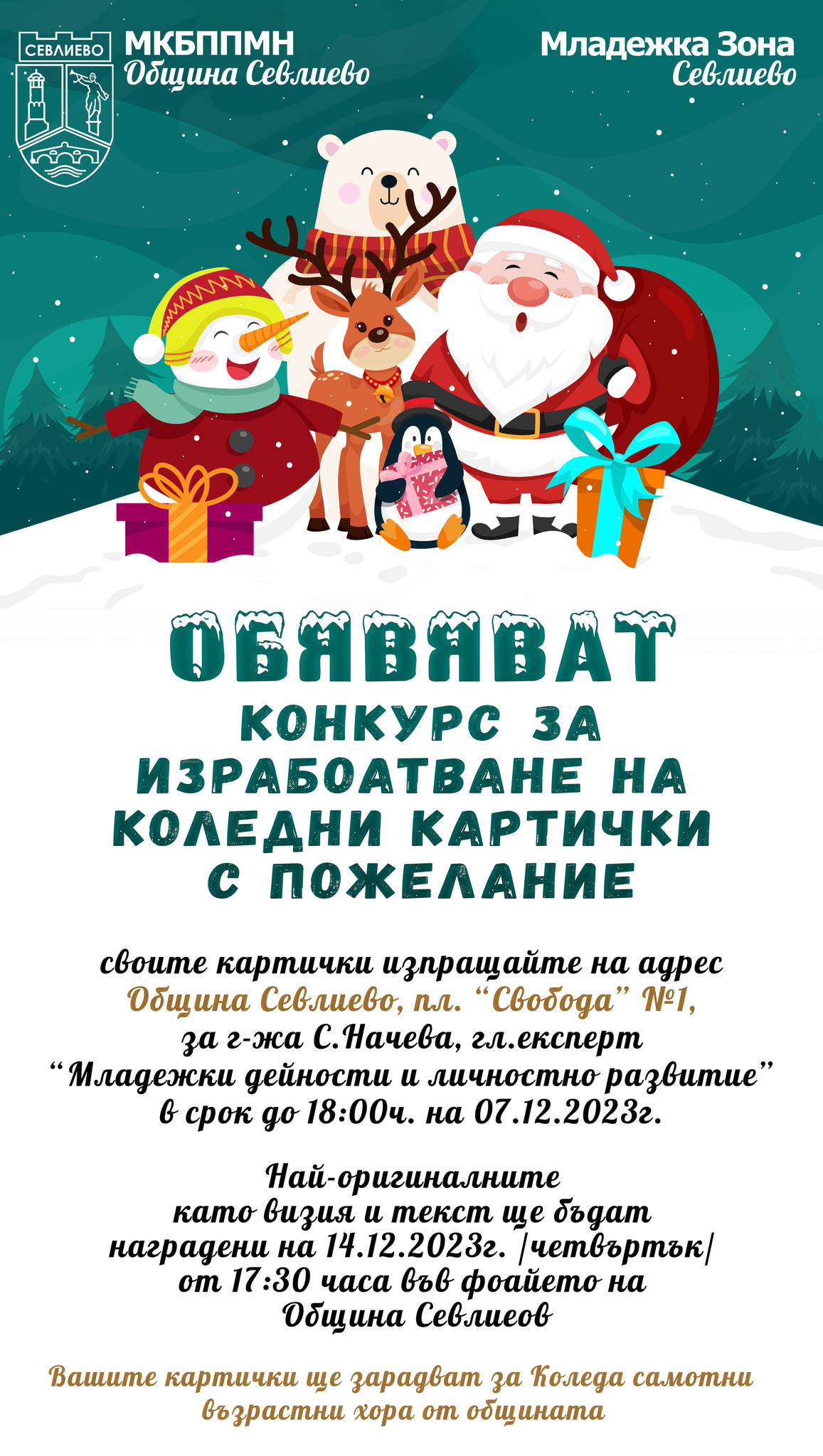Местната комисия за борба с противообществените прояви на малолетни и непълнолетни към Община Севлиево и Младежка зона – Севлиево обявиха традиционния конкурс за изработване на коледни картички с пожелание. Артсъревнованието е насочено към всички деца и младежи на територията на общината.