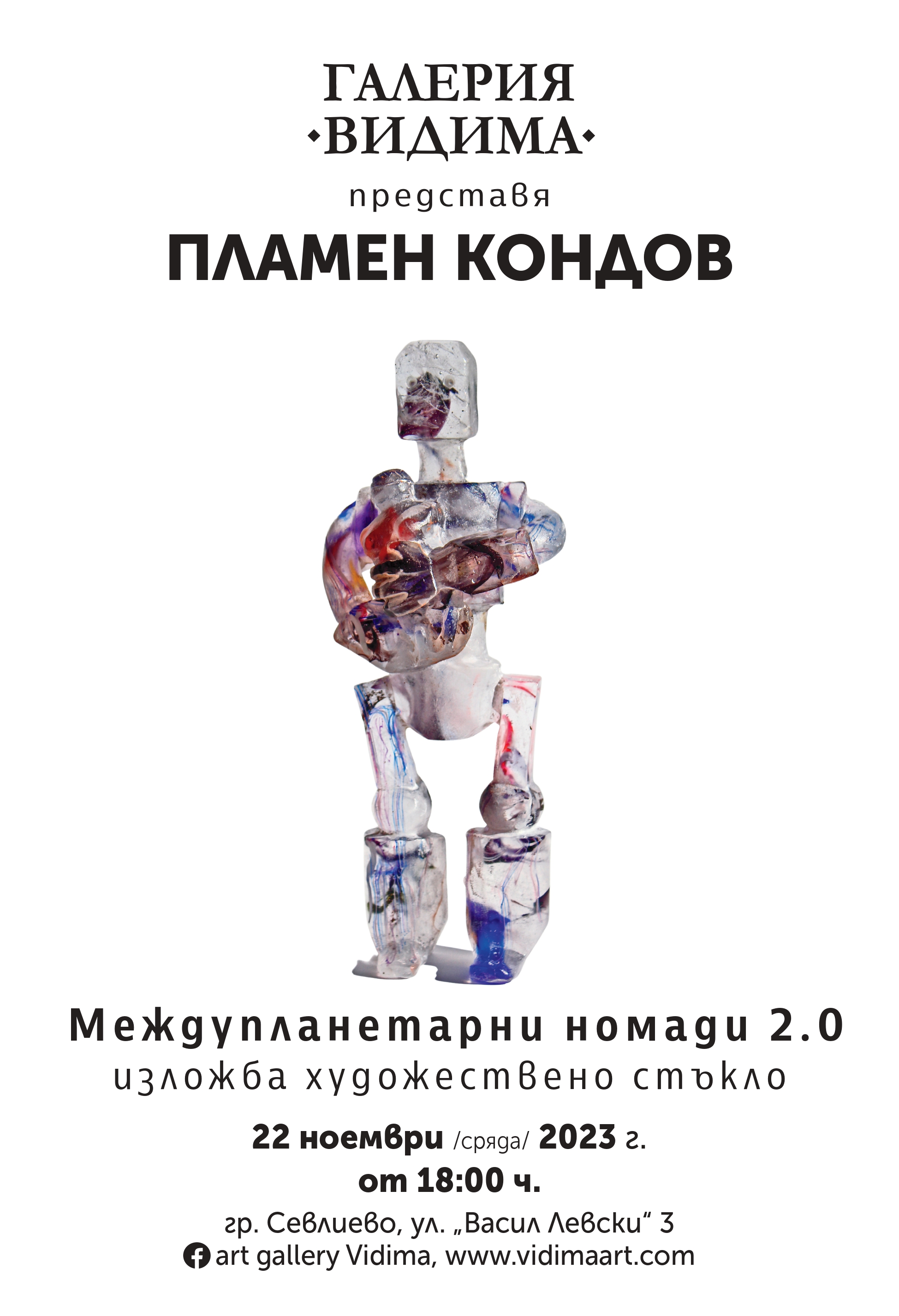 Новата изложба в галерия „Видима“ ще превърне експозиционното ни пространство в космическа станция за междупланетарни полети и място за среща на различни земни и извънземни видове, интелигентни роботи и пътешественици не само в пространството, но и във времето. Футуристичната обстановка, в която ще попаднат всички гости на събитието, младият и талантлив артист Пламен Кондов постига с помощта на един от най-трудните за боравене материали – стъклото, вдъхновен от фантастиката в литературата и киното, от научния, технически и цивилизационен прогрес, и разбира се от неговите уникални физико-химични свойства. Стъклото има дълголетна връзка в изследването на космоса, денс то се използва активно в космическото инженерство, но именно благодарение на оптични му свойства още преди повече от 400 години Галилей прави първите наблюдения на космически обекти.