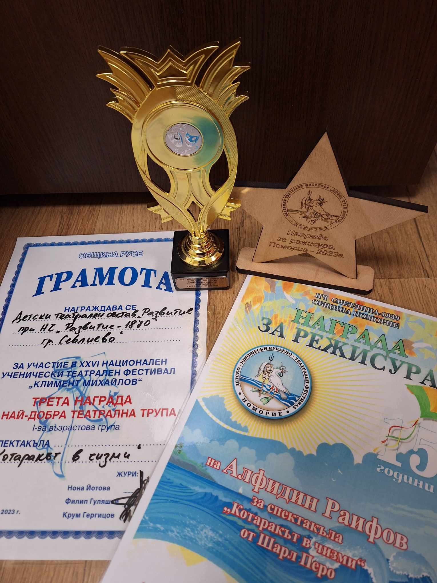 Театралите получиха и отличията от националния фестивал „Сцена край морето” в Поморие. Наградата за актьорско майсторство бе връчена на Петя Маркова. Наградата за режисура на постановката „Котаракът в чизми” заслужено получи режисьорът Алфидин Ахмедов. Грамоти за дебют на театрална сцена в спектакъла „Котаракът в чизми” получиха малките театрални надежди – Никол Партовска, Михаела Василева и Катерина Василева. Грамота за артистично присъствие, принос и експресно влизане в ролята на Жан заслужи Денислав Богданов.