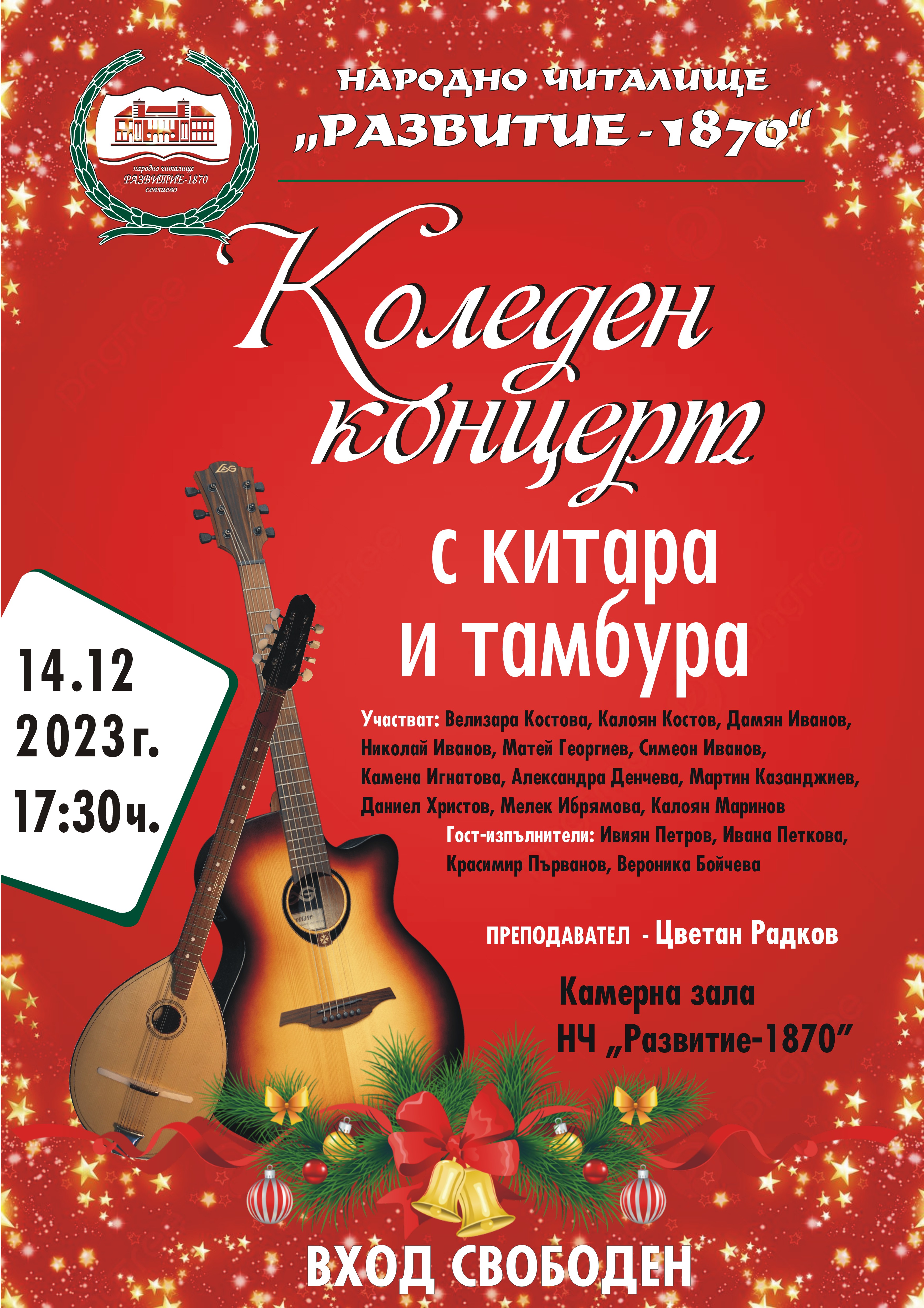 Школата по китара и тамбура ще зарадва севлиевци с Коледен концерт на 14 декември, от 17:30 часа, в Камерната зала на при Народно читалище „Развитие-1870”. Участват учениците на преподавателя Цветан Радков – Велизара Костова, Калоян Костов, Дамян Иванов, Николай Иванов, Матей Георгиев, Симеон Иванов, Камена Игнатова, Александра Денчева, Мартин Казанджиев, Даниел Христов, Мелек Ибрямова, Калоян Маринов и гост-изпълнителите Ивиян Петров, Ивана Петкова, Красимир Първанов, Вероника Бойчева.