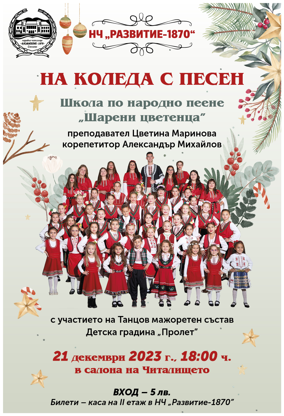 На концерт „На Коледа с песен” канят талантливите деца от Школата по народно пеене на 21 декември 2023 г., от 18:00 ч., в салона на НЧ „Развитие-1870”. В навечерието на най-светлите празници учениците на музикалния педагог Цветина Маринова ще поднесат коледен благослов от песни. В програмата ще участва и Танцов мажоретен състав при детска градина „Пролет”.