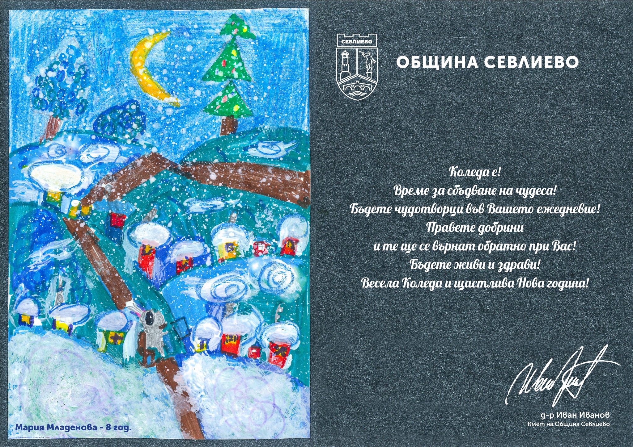 Със специалната награда на Местната комисия за борба с противообществените прояви на малолетните и непълнолетните към Община Севлиево беше удостоена 8-годишната Мария Иванова Младенова от ОУ „Стефан Пешев“. Коледната картичка на малката художничка, заедно с отличения текст на Михаела Кирилова, ще бъде тазгодишният празничен поздрав на кмета на община Севлиево към всички институции, партньори и приятели на нашата община.