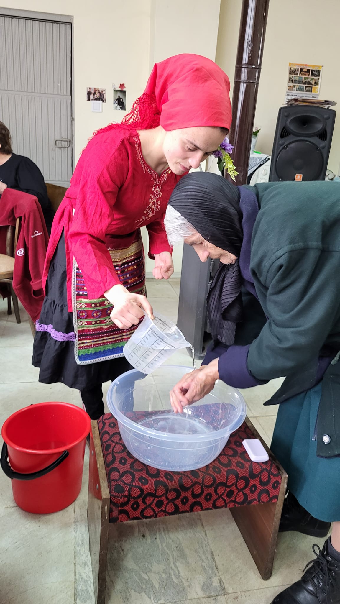 И ето че на импровизираната сцена се появяват две дами – невястата, в чийто образ се въплъти младата Теодора Ивайлова, а 92-годишната Дешка Ненчева беше бабата акушерка. Под любопитните погледи на 50 зрители беше изпълнен обичаят „Поливане“, както и даряване на бабата. С много уважение беше почетена и обичаната от всички стоматоложка Пенка Маринова.