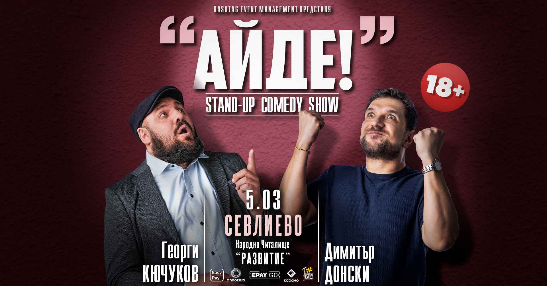Билети за стендъп комедията „Айде!” може да закупите на касите на EasyPay и epaygo.bg. Шоуто не се препоръчва за лица под 18 г.