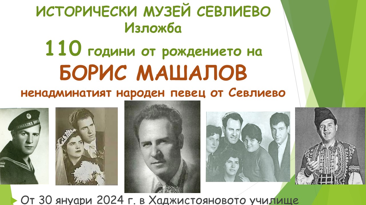 Борис Машалов не само изпя, но сякаш изплака песента „Заблеяло ми агънце“, песен, с която и днес докосва сърцето на всеки българин. Още десетки песни в негово изпълнение продължават да са популярни, а неговият неподражаем глас е разпознаваем от всички. По повод 110-ата годишнина от рождението на най-известния изпълнител на северняшки песни, нашият земляк Борис Машалов от 30 януари в Хаджистояновото училище, макар и с ограничен брой експонати, ще бъде подреден малък музеен кът. В него ще покажем оригинална снимка на прочутия народен певец от времето, когато отбивал военната си служба в униформа на водолазна команда, грамофонни плочи с негови изпълнения, кратка справка за живота и песните му, запазени материали от чествания, фотокопия и експонати от фонда на музея от средата на 20 век, когато Борис Машалов е на върха на славата си.