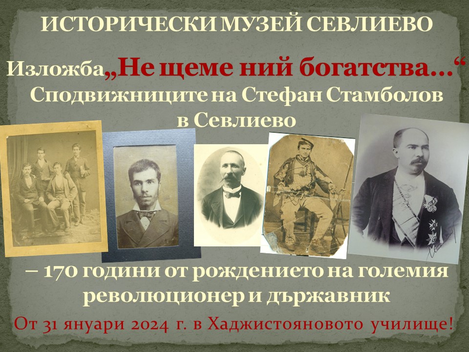 Навършват се 170 години от рождението на революционера и един от първите и най-изявени български държавници. Годишнината ще бъде отбелязана с чествания и изложби в големите български градове. Тя е повод и за поредната изложба на Исторически музей Севлиево под надслов „Не щеме ний богатства…”, строфа от известната революционна песен по текст на Стамболов: „Не щеме ний богатства, не щеме ний пари, а искаме свобода, народни правдини! Тази песен е окрилявала младите „комити” – по време на подготовката на Априлското въстание връстниците Стефан Стамболов и Стефан Пешев са едва навършили 20 години. Стамболов е роден в Търново на 31 януари 1854 г., възпитаван от баща си – участник във Велчовата завера и неговите съмишленици отец Матей Преображенски и Христо Иванов Големия. Учи в Търново, а сетне в Духовната семинария в Одеса, откъдето е изключен заради контактите си с руските революционери. За кратко се завръща в Търново и през 1874 г. заминава за Влашко. През септември 1874 година присъства като делегат от Търновски окръг на събранието на БРЦК и е изпратен в България с апостолската мисия да активизира местните комитети. Участва в подготовката и хода на Старозагорското въстание, след потушаването на което е определен за главен апостол на Първи Търновски революционен окръг.