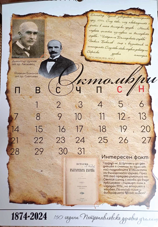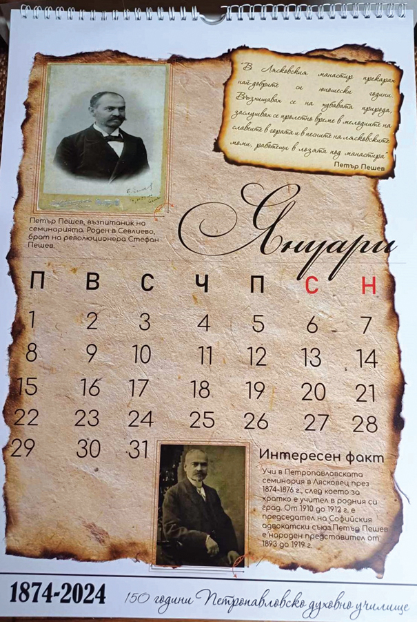 На 150 години стана Петропавловско духовно училище. По този повод от Светата обител са издали луксозен календар с най-изтъкнатите си възпитаници. Сред тях са и двама севлиевци. Първият месец – януари, е посветен изцяло на нашия съгражданин Петър Пешев, брат на Севлиевския Апостол на свободата – Стефан Пешев. В изданието е намерил място и друг наш земляк – Йоаким Бакалов, който става първият ректор на Софийска духовна семинария.