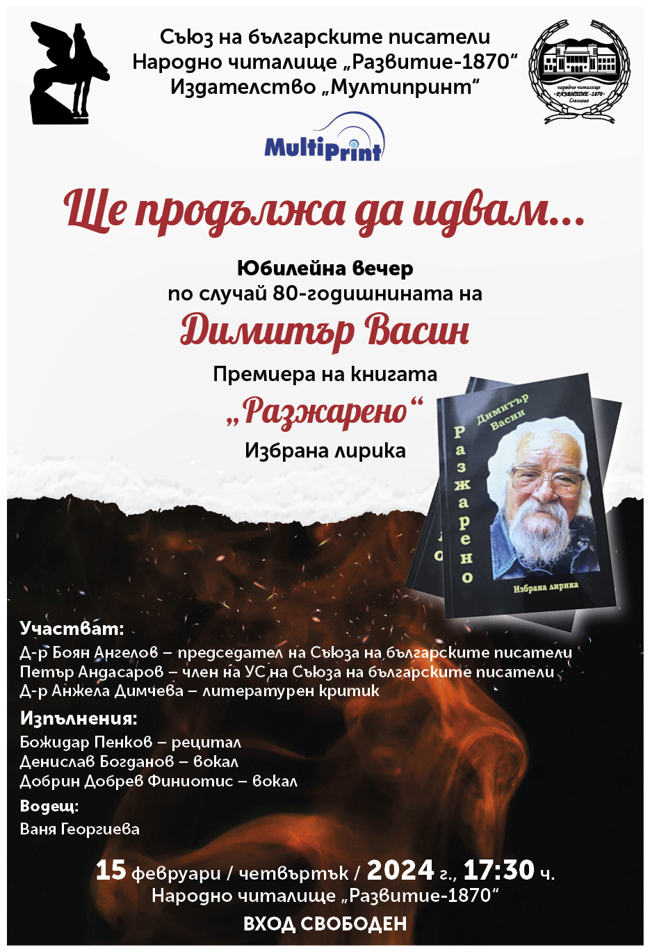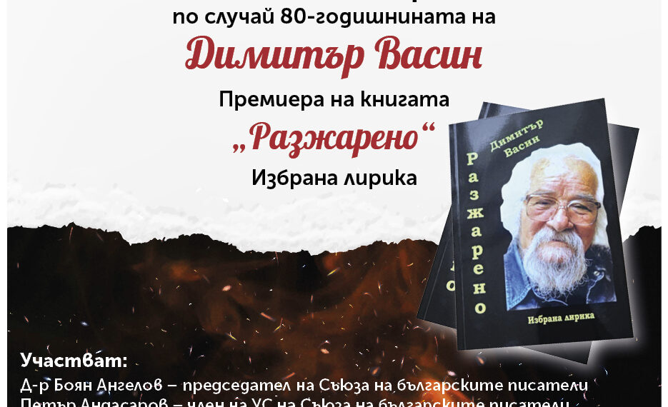 80-годишен юбилей ще чества доайенът на поезията в Севлиево Димитър Васин. Събитието ще се състои на 15 февруари, от 17:30 ч., в салона на Народно читалище „Развитие-1870”. Ръководителят на Литературен кабинет „Пеньо Пенев” и член на Съюза на българските писатели ще представи новата си книга „Разжарено”.