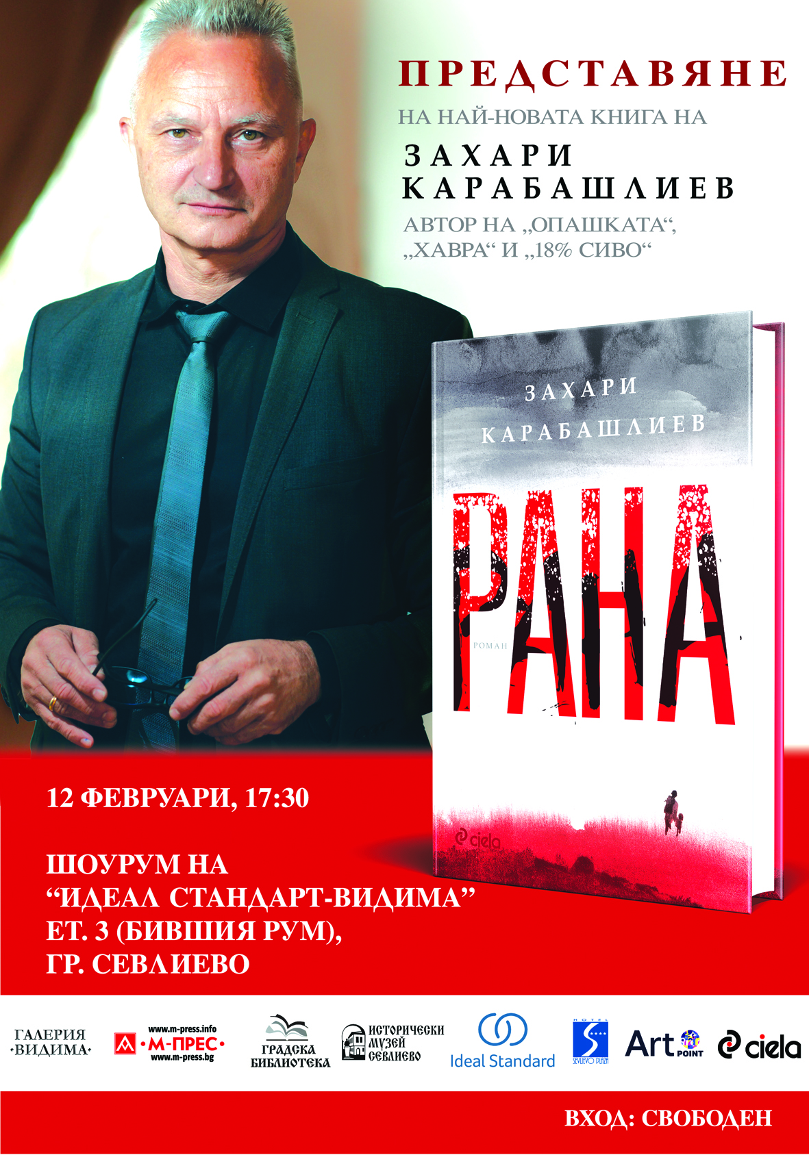 Известният български писател Захари Карабашлиев ще представи в Севлиево най-новия си роман – „Рана“. Срещата с него ще се проведе на 12 февруари, понеделник, от 17:30 ч. в галерия „Арт зона“ (трети етаж на бившия РУМ). Там почитателите му ще могат да закупят книгата (с меки и твърди корици) и да получат автограф от автора.