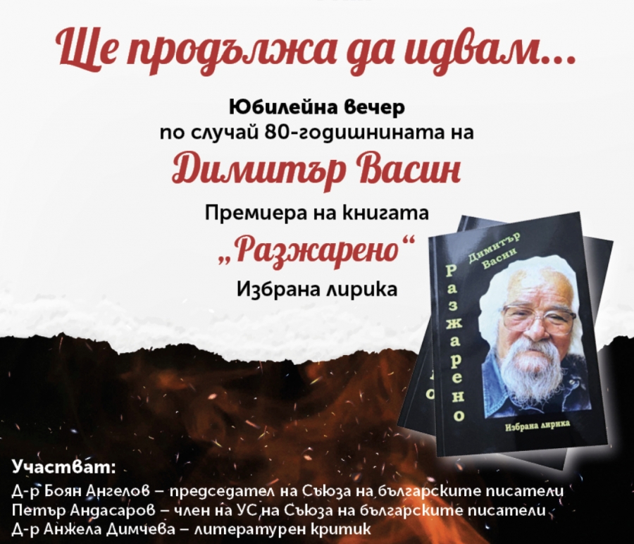 Ръководителят на Литературен кабинет „Пеньо Пенев” и член на Съюза на българските писатели ще представи и новата си книга „Разжарено”.