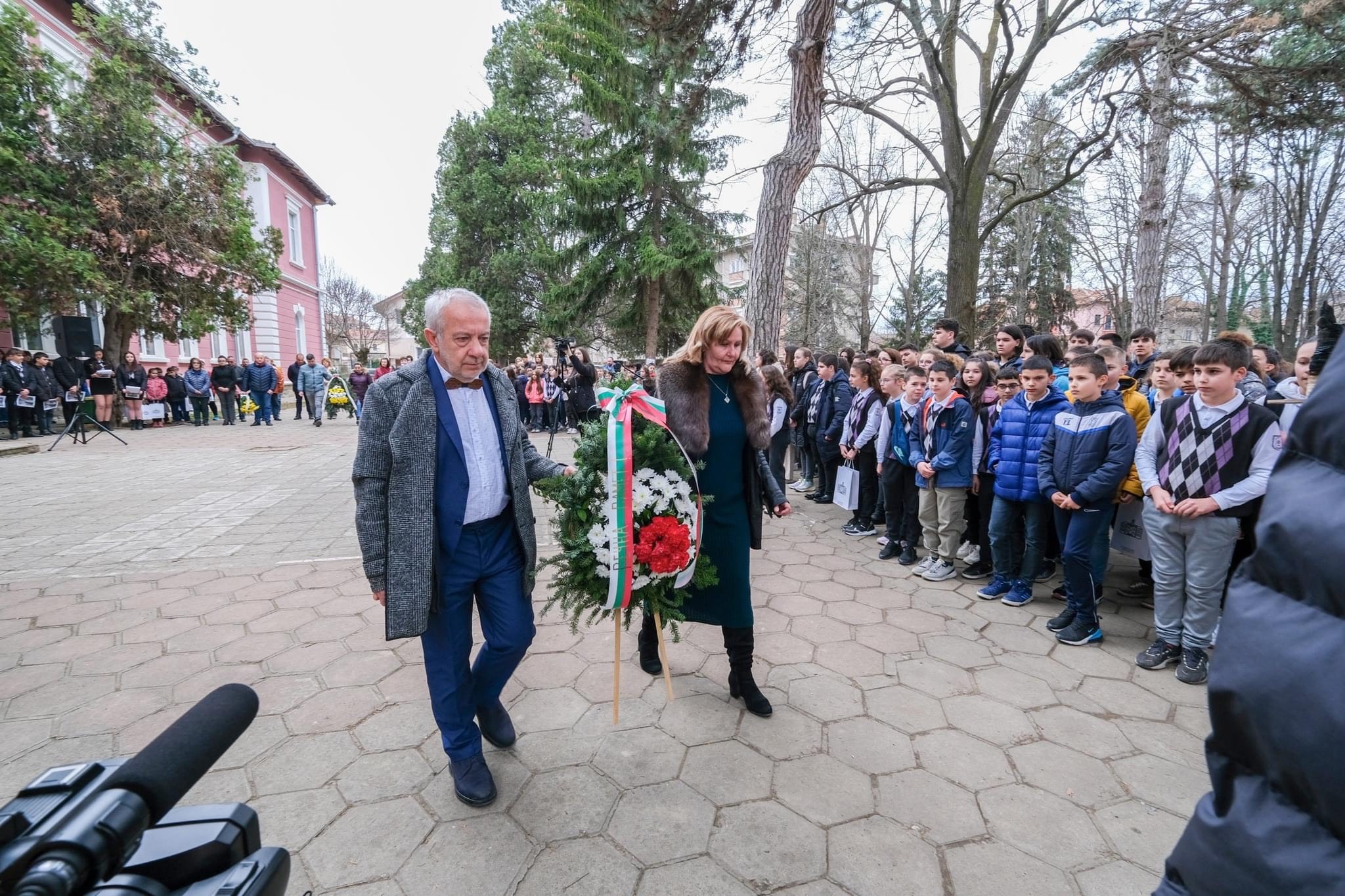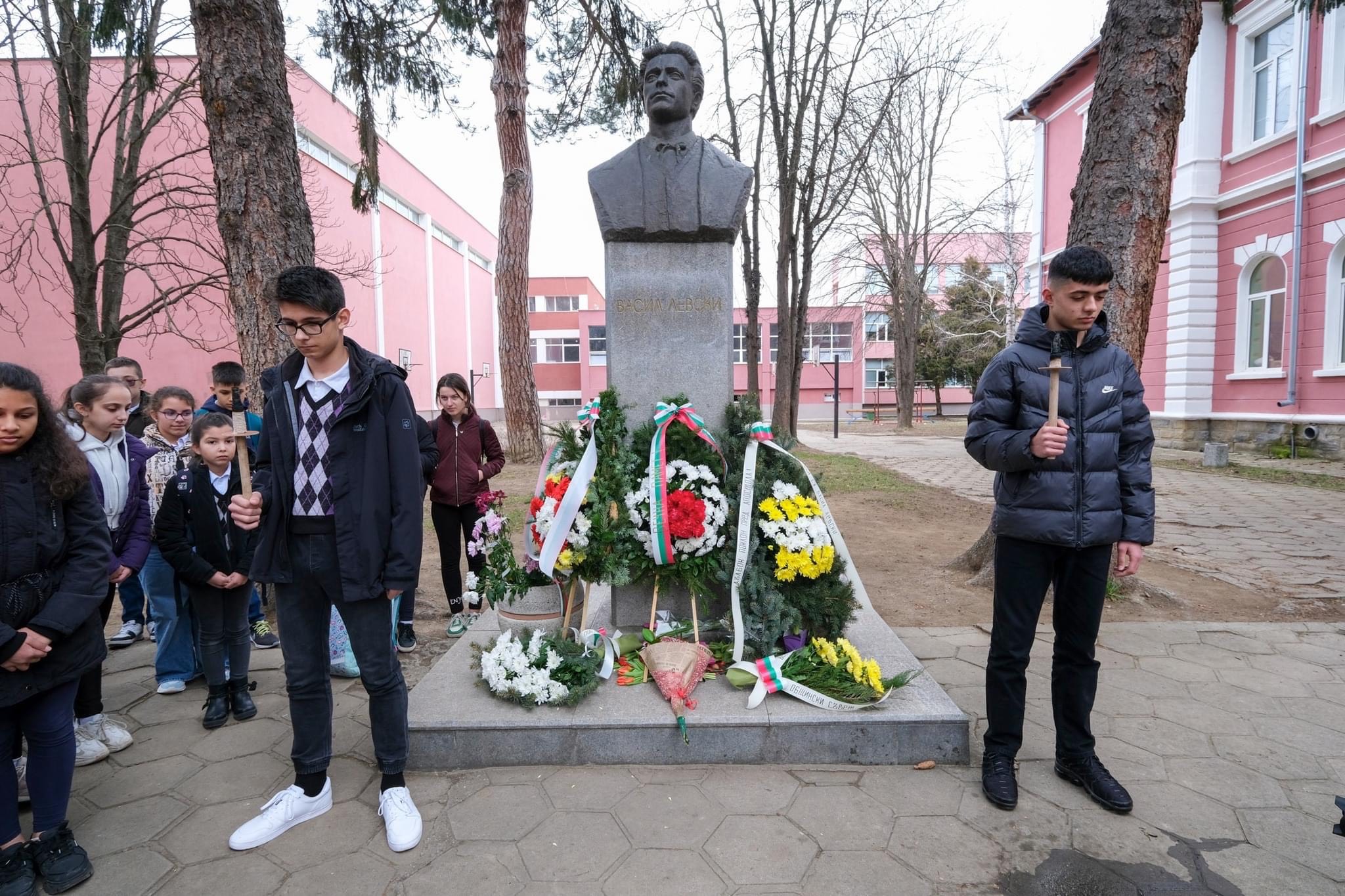 След едноминутно мълчание и рецитал на осмокласници върху въздействащата музика на „Притули се планината“ гостите на събитието поднесоха цветя и венци пред паметника на Васил Левски.