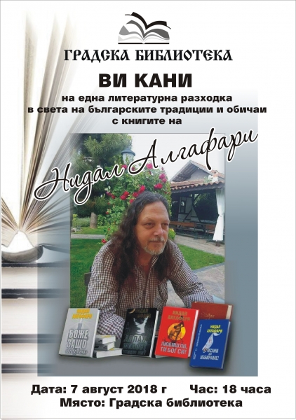 Писателят и режисьор Нидал Алгафари ще пристигне в Севлиево, за да представи новите си четири книги пред жителите и гостите на града. Срещата-разговор ще се състои на 7 август, вторник, от 18:00 часа в Градската библиотека. Популярният автор ще разкаже за тетралогията „Боже, защо Господ лъже?”, „Аллах, милост нямаш ли?”, „Любиш ли, ти Бог си” и „Орисани да избираме”.
