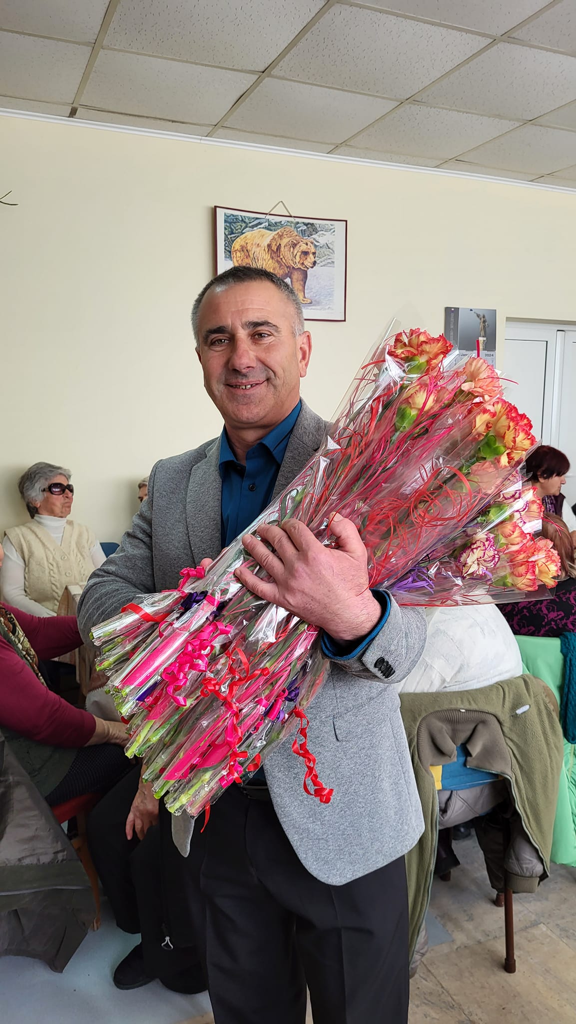 Прегърнал огромен букет от карамфили, кметът Айхан Ибрям изненадващо се появи и почете всяка жена с цвете.