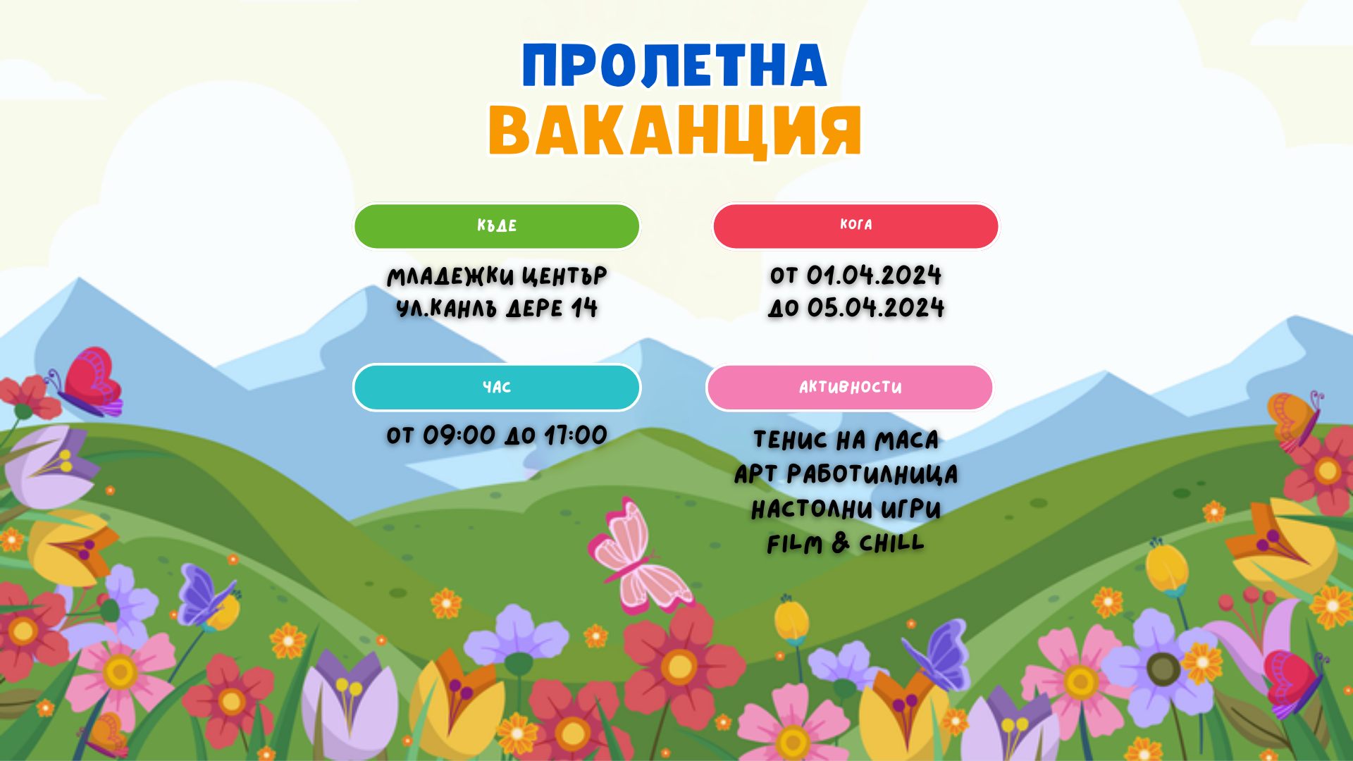 Пролетната ваканция ще стартира на 1 април с турнир по тенис на маса. На 2 април младежката зона ще бъде превърната в арт работилница, в която ще се изработват аксесоари от плат и подръчни материали, под ръководството на дизайнерката Стефка Проданова, и които ще бъдат предлагани за продажба на благотворителния щанд на фондация „Искам бебе“ в рамките на фестивала „Семе българско“. За 3 април е предвиден филмов ден с приятели – „Film &Chill“, а за следващия ден – 4 април, „Ваканция с настолни игри“. Ваканционната програма ще завърши на 5 април отново с арт работилница, но този път за изработване на аксесоари от прежда и подръчни материали, също предназначени за благотворителния щанд на фондация „Искам бебе“.