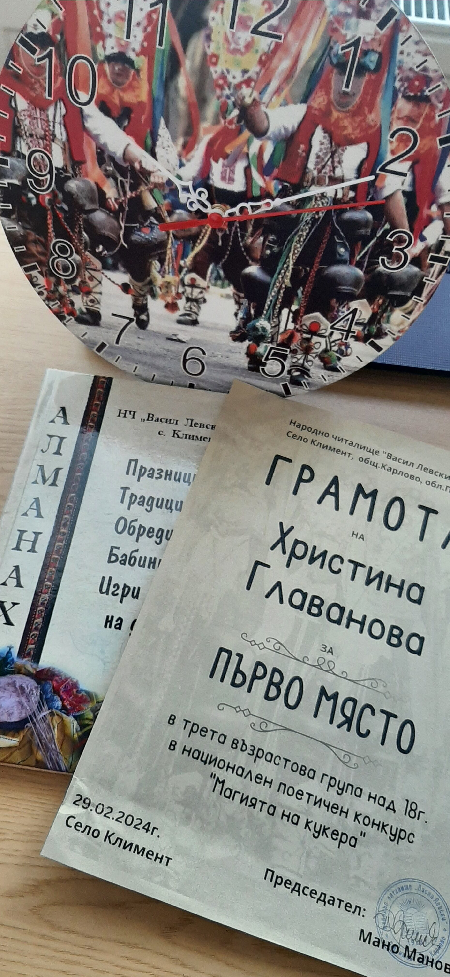 Не по-малко вълнение донесе на поетесата участието й в друг национален литературен конкурс, този път посветен на магията на кукерите, където тя заслужено бе отличена с престижната първа награда. Стихотворението „Старчовден в село Климент”, написано специално за конкурса, успешно се пребори с конкуренцията на повече от 80 автори от цялата страна и успя да впечатли журито с доброто познаване на традициите, с образния си поетичен език, с добра композиция и умело изведена идея.