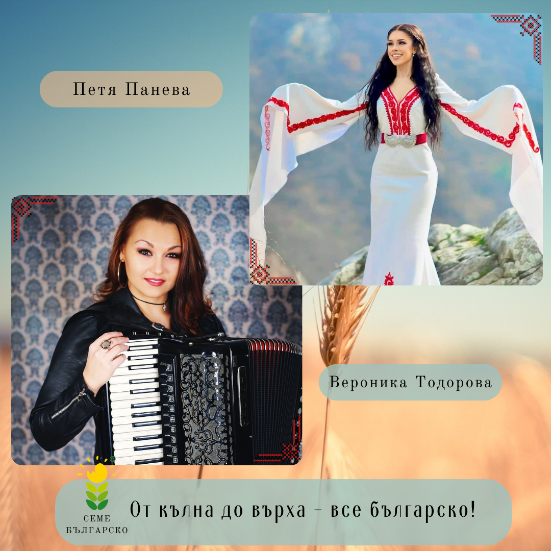 Две имена на безспорни таланти блестят ярко в тазгодишната музикална програма на националния фестивал „Семе българско“, който ще се проведе на 27 и 28 април в Севлиево – Вероника Тодорова – носителка на титлата „Най-добрата акордеонистка в света“ от световното първенство в Норвегия през 2006 г. и „Майстор на Германия“ от същата година, и победителят в „Гласът на България“ през 2021 г. – Петя Панева.