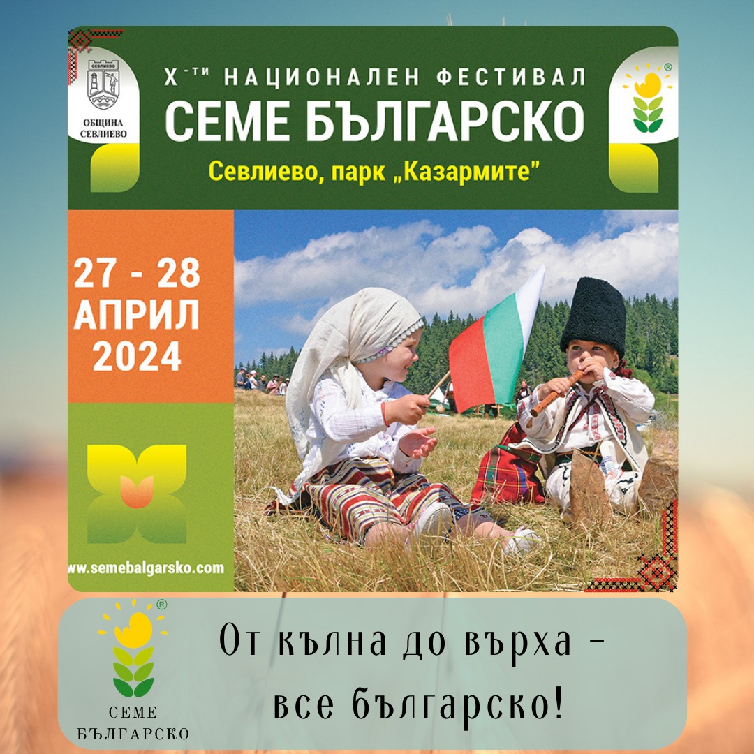 На 27 и 28 април Севлиево посреща първото юбилейно издание на Националния фестивал „Семе българско”. Всяка година фестивалът развива, обогатява и надгражда инициативите и събитията в своята програма, за да предложи разнообразие от активности без аналог, всички подчинени на основната кауза – да съхраним българщината, да заздравим връзката с корените си, да предадем старите знания на следващите поколения.