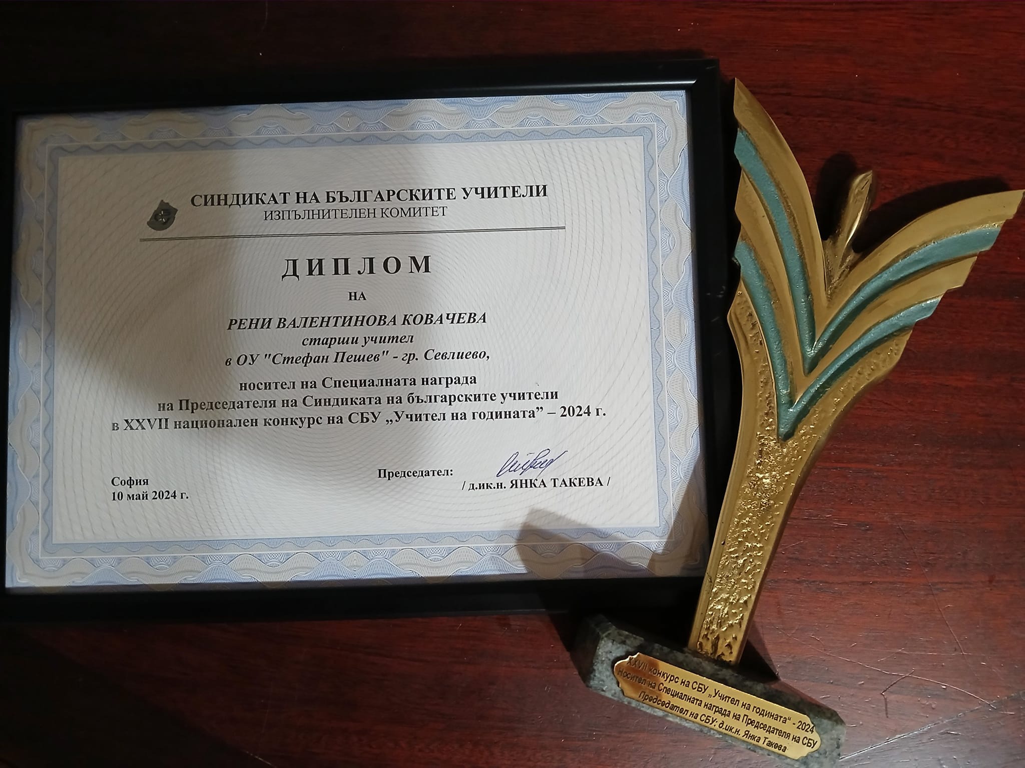 Преподавателката по изобразително изкуство в ОУ „Стефан Пешев“ – Рени Ковачева, стана носител на Специалната награда на председателя на Синдиката на българските учители – Янка Такева. Това стана на тържествена церемония в София, на която за 27-ми път Синдикатът на българските учители (СБУ) към КНСБ връчи наградите от Националния конкурс „Учител на годината“.