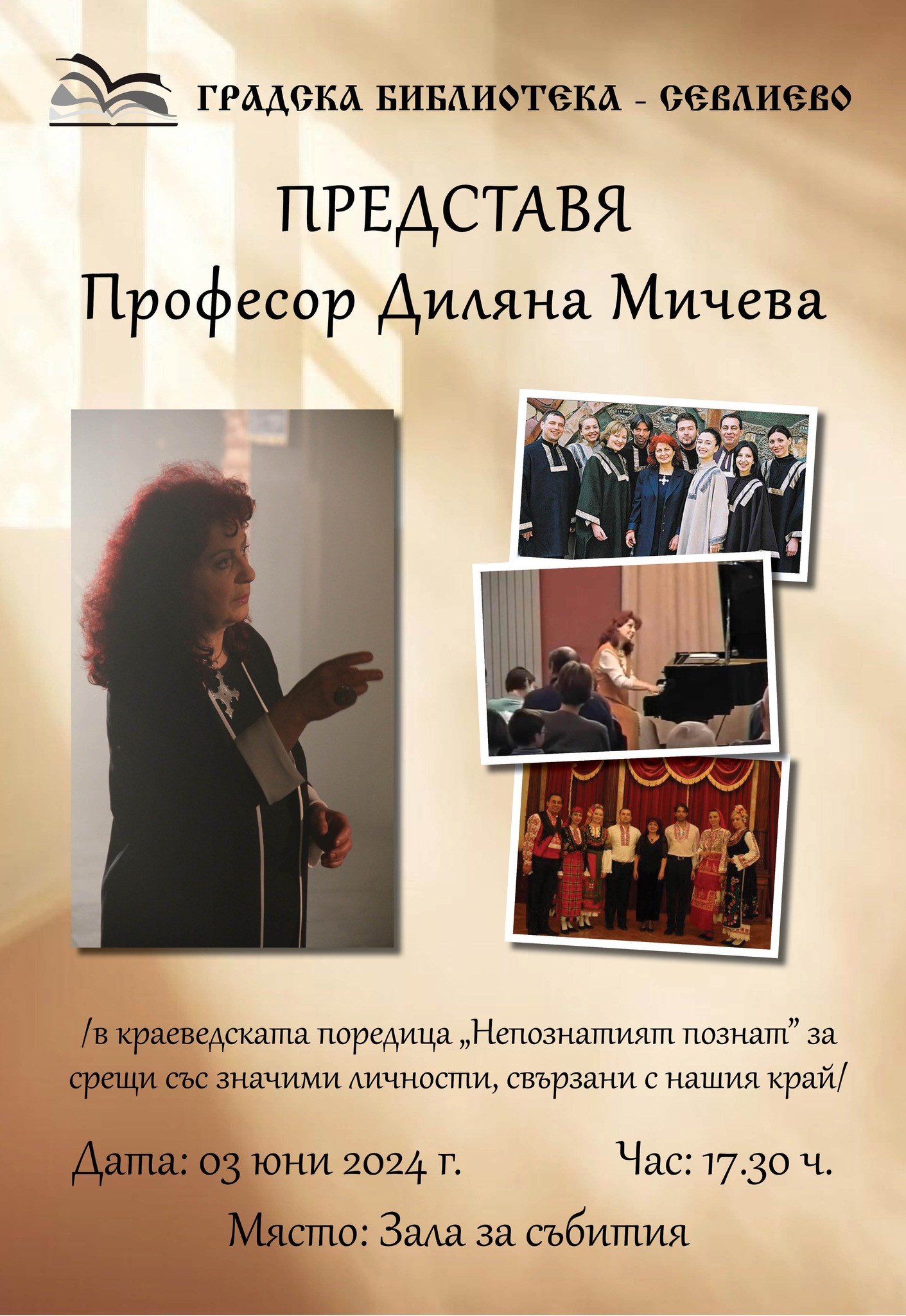 Проф. Диляна Мичева ще бъде поредният гост в краеведската поредицата на Градската библиотека „Непознатият познат”. Севлиевци могат да се срещнат с нея на 3 юни, понеделник, от 17:30 часа.