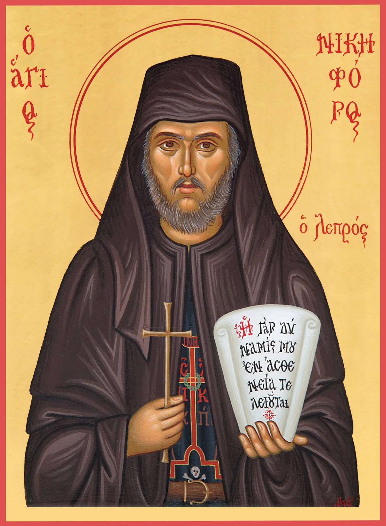 Свети Никифор е роден на остров Крит през 1890 година. На 13 години се разболява от проказа и 60 години е страдал от тази болест. Целият си живот е прекарал в болница, изолиран от света. В Гърция го наричат тайния светец, тъй като неговите духовни подвизи са били известни на малцината, които са го познавали. Неговият живот е бил изцяло посветен на Бога – той е пример за търпение, целомъдрие, молитва, себеотрицание и любов. Тихо е носел своя кръст на мъченик, макар да не е пролял и капка кръв. За свети Никифор се знае, че чува молитвите на вярващите много бързо и помага за хора, страдащи от рак, психични разстройства, сърдечни заболявания, зависимости, душевни проблеми, очни болести, безплодие, семейни неразбории и множество тежки заболявания. Мощите му са вградени в икона с образа на съвременния светец, чието успение е през 1964 година, на 4 януари, когато се чества и неговия празник.