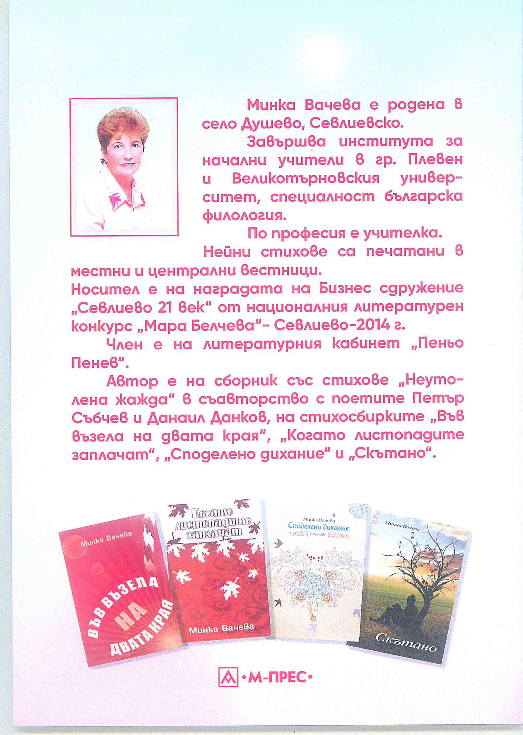 „Оцеляла струна“ е заглавието на петата и последна засега стихосбирка на севлиевската поетеса Минка Вачева. Между кориците й са намерили място 46 стихотворения, някои от които са посветени на най-близките й хора – на покойния й съпруг, на дъщеря й и внучката, както и на приятелите от литературния кабинет. „Стиховете са разнообразни. Има и по-оптимистични, по-светли стихове, има и по-тъжни. Тези чувства вървят ръка за ръка“, разказва авторката. Тя не крие, че много неща в ежедневието я провокират да грабне перото, но най-вече това е желанието хората да бъдат по-добри, по-човечни, по-смирени в днешния ден, и още – добротата и обичта между хората, за която всички копнеят.