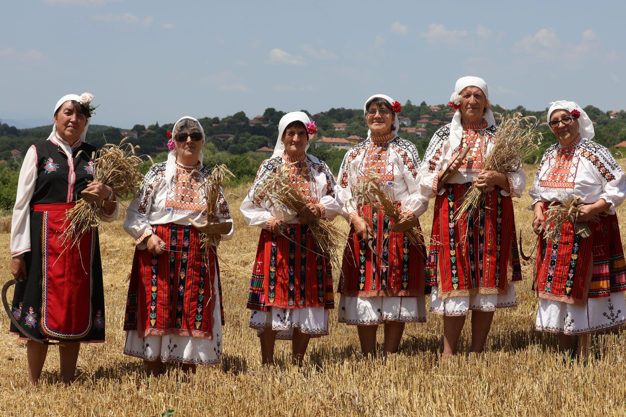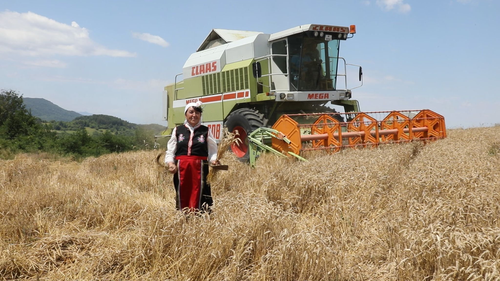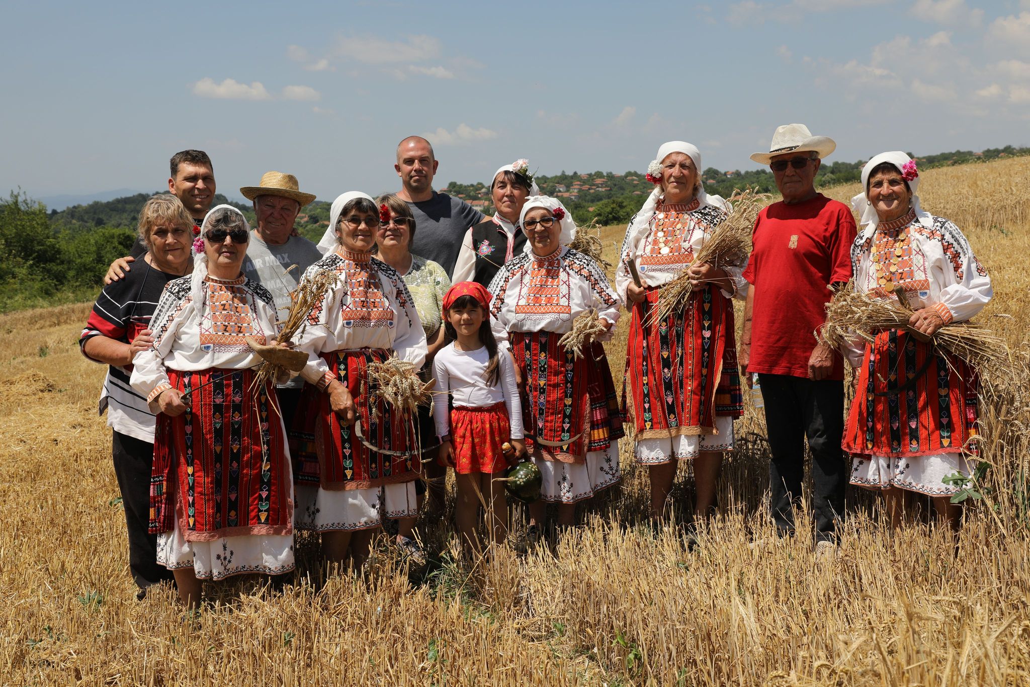 Пристигаме всички на малкото бозалъче преди нивата. Напред пристъпват само фотографът Мирослав и стопанинът Ганчо. Шум от комбайн още не се чува. Изчакваме под тънката сянка на един сливов шубрак и скоро по пътя между нивите се задава голямата машина. Промъква се покрай нас и застава в началото на нивата. Младите мъже проверяват състоянието на техниката. Силният шум повдига още настроението. Към нивата пристъпват жетварките с песен. Води ги ръководителката Цветана Караколева. Сърповете и паламарките са в ръцете им. С тях е и нашето най-малко участниче – Катето. Тя отговаря за стомната със студена вода и за това, жътварките да не са жадни.