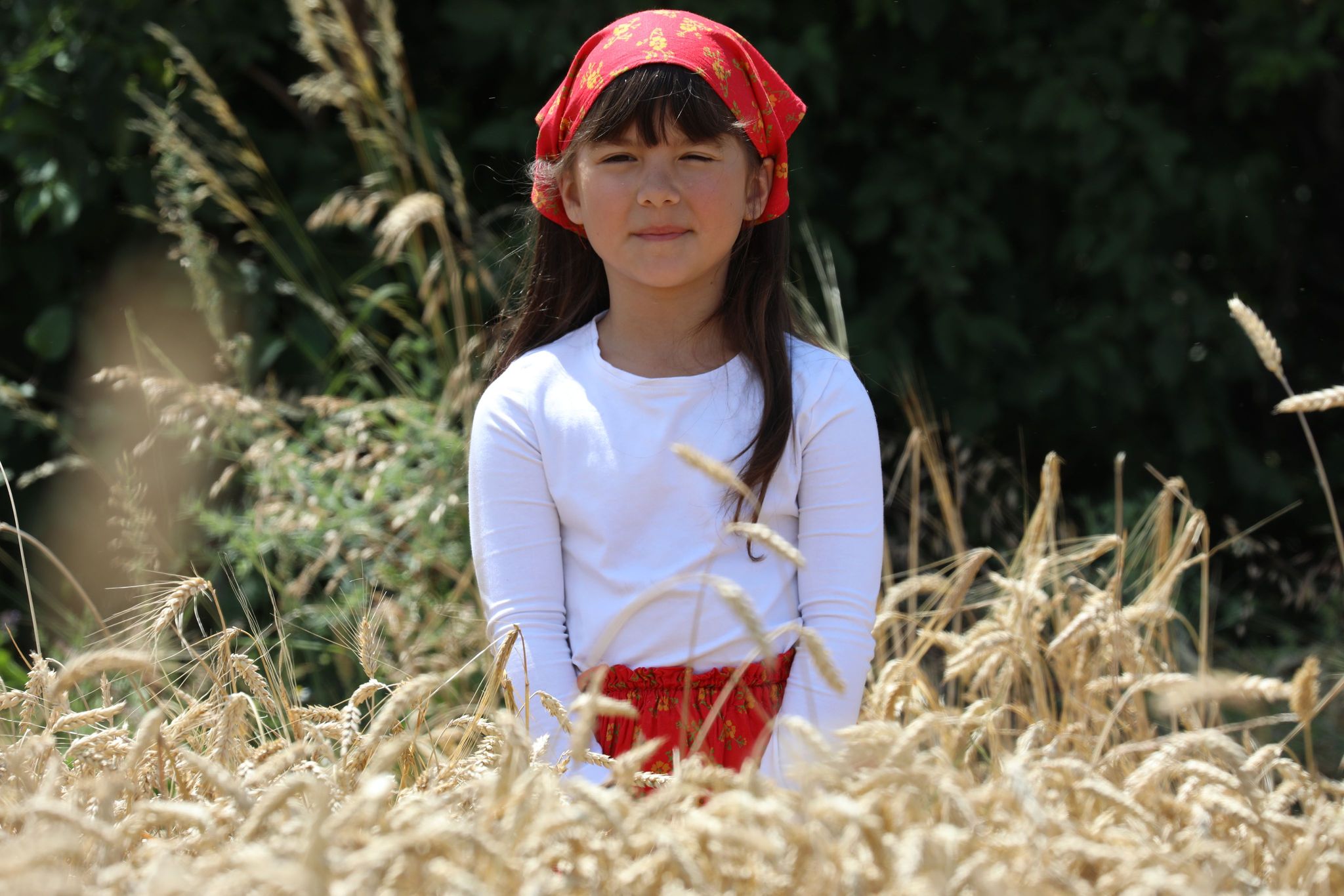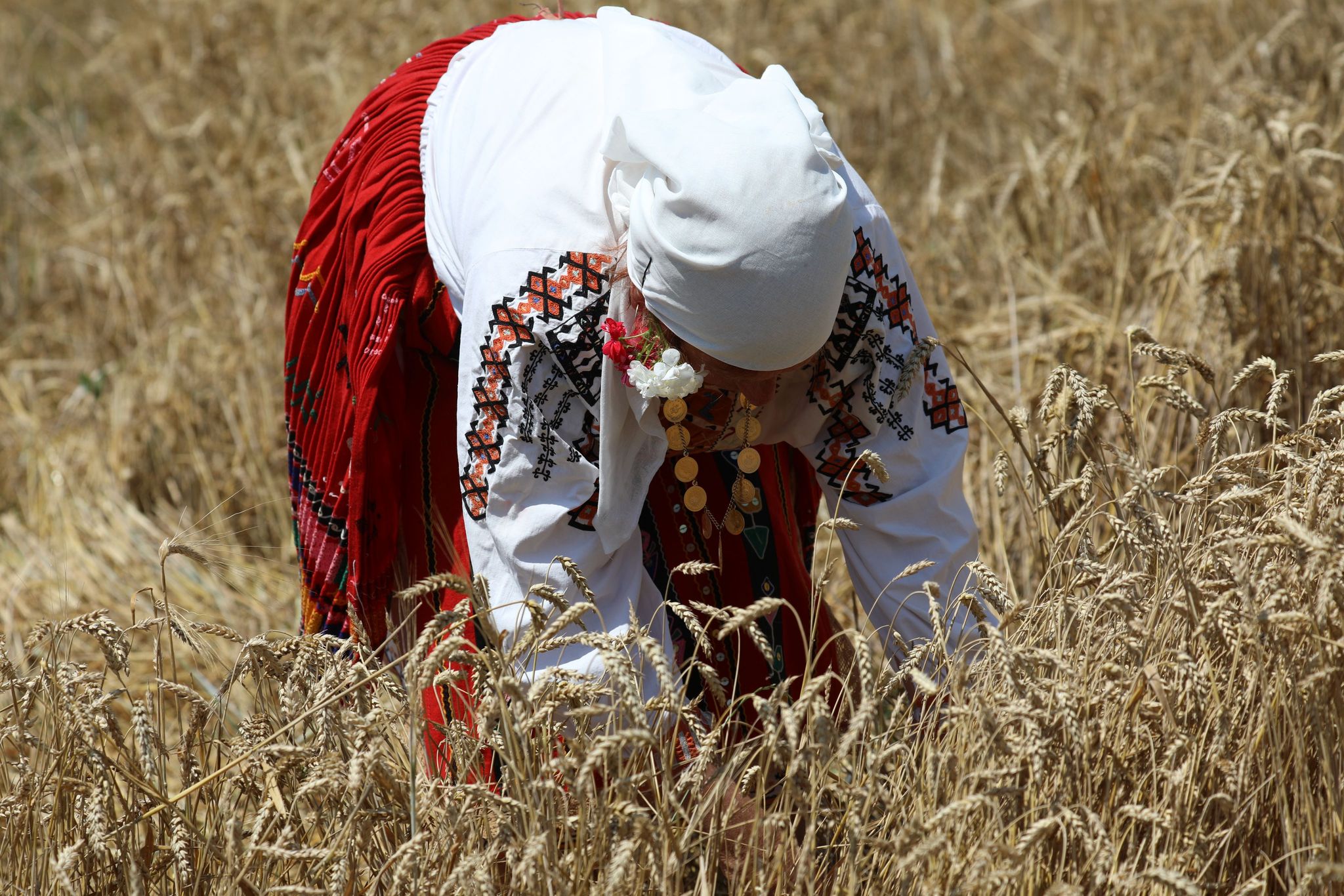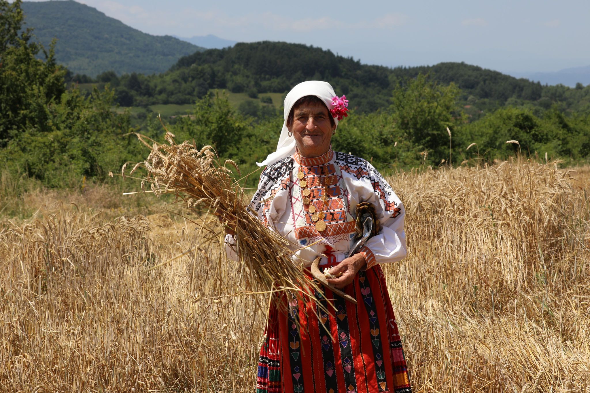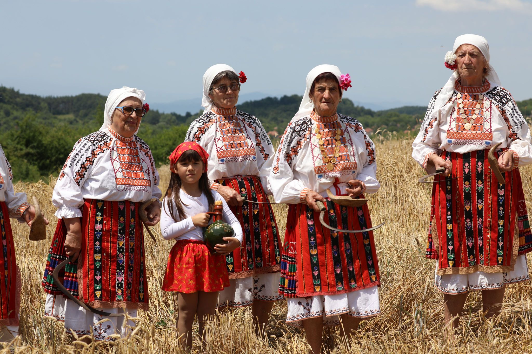 Пристигаме всички на малкото бозалъче преди нивата. Напред пристъпват само фотографът Мирослав и стопанинът Ганчо. Шум от комбайн още не се чува. Изчакваме под тънката сянка на един сливов шубрак и скоро по пътя между нивите се задава голямата машина. Промъква се покрай нас и застава в началото на нивата. Младите мъже проверяват състоянието на техниката. Силният шум повдига още настроението. Към нивата пристъпват жетварките с песен. Води ги ръководителката Цветана Караколева. Сърповете и паламарките са в ръцете им. С тях е и нашето най-малко участниче – Катето. Тя отговаря за стомната със студена вода и за това, жътварките да не са жадни.