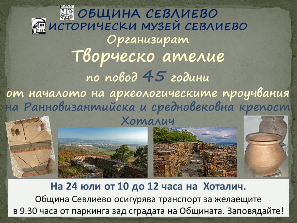 Творческо ателие по повод 45 години от началото на археологическите проучвания на ранновизантийската и средновековна крепост Хоталич организира екипът на Историческия музей. Това ще стане днес – 24 юли, от 10:00 до 12:00 часа на разкопките. „Идеята на ателието е да запознаем децата, които проявяват интерес към историята, с работата на археолозите и с археологическите проучвания, които се извършват в продължение на 45 години от Историческия музей с финансовата подкрепа на Община Севлиево. Освен това заедно ще рисуваме, ще търсим съкровища, ще редим пъзели и ще се забавляваме. Всички са добре дошли“, отправя покана директорът на музея Ивета Миленова.